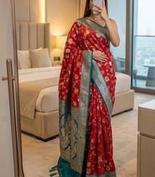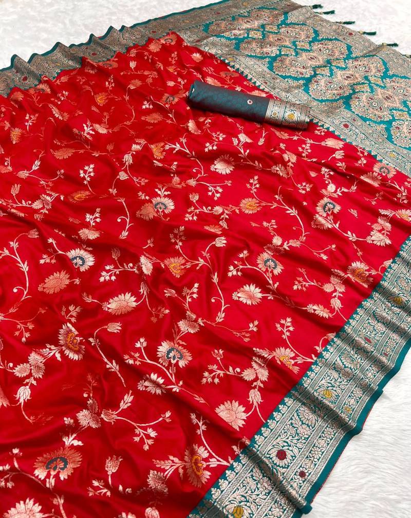 Red soft silk blend saree with zari weaving meenakari design