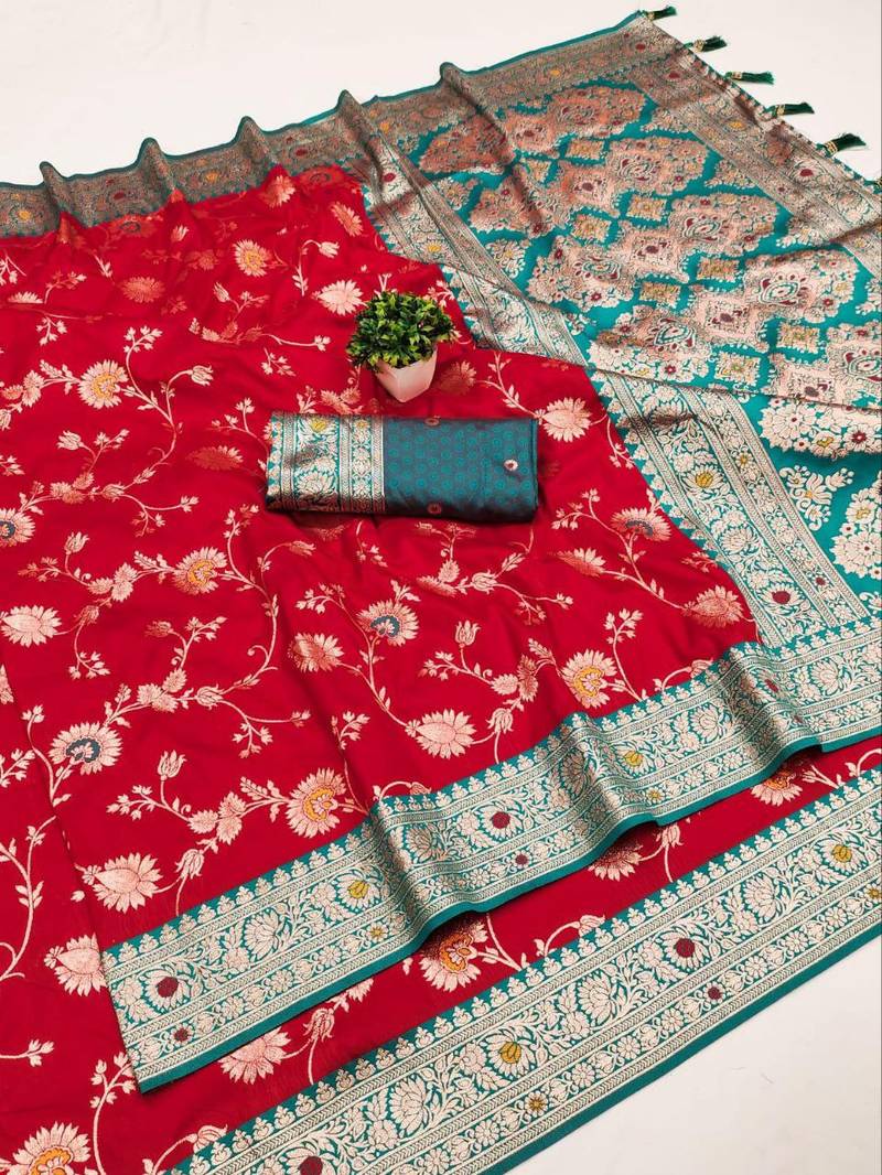 | Product Name | Red Soft Silk Blend Saree With Zari Weaving Meenakari Design | |
