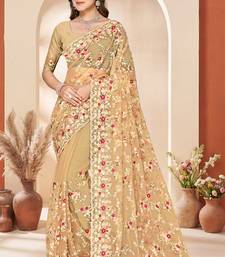 Mustard heavy resham sequin embroidered work net saree sari for women