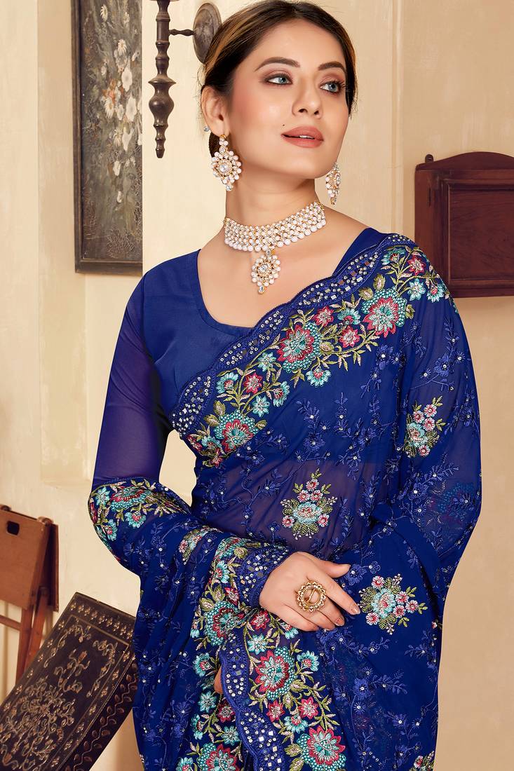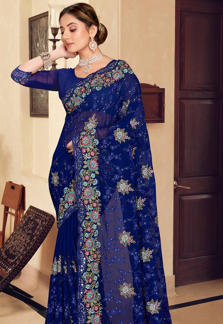 | Product Name | Navy Blue Sequin Zari Resham Stone Embroidered Georgette Designer Saree For Women | |