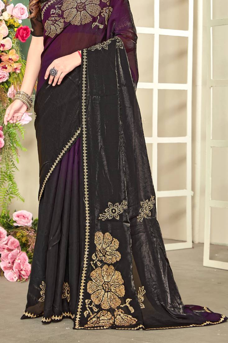 | Product Description | Get An Elegant Looking In This Half N Half Purple Color Indian Bollywood Ethnic Style Designer Party Wear Traditional Wedding Satin Silk Saree, Completed With Heavy Zari Embroidered And Stone Border Work. It Will Carry Black Color Unstitched Satin Silk Blouse Piece, Which Can Be Customized Up To Max 42 Indian Standard Size And Its Length 80 Cms. (Slight Variation In Color Is Possible Due To Flash Used During Photo Shoot. Blouse Shown In The Image Is Used For Photo Shoot Purpose Only, Un Stitch Blouse Piece Is Attach With Saree.) |