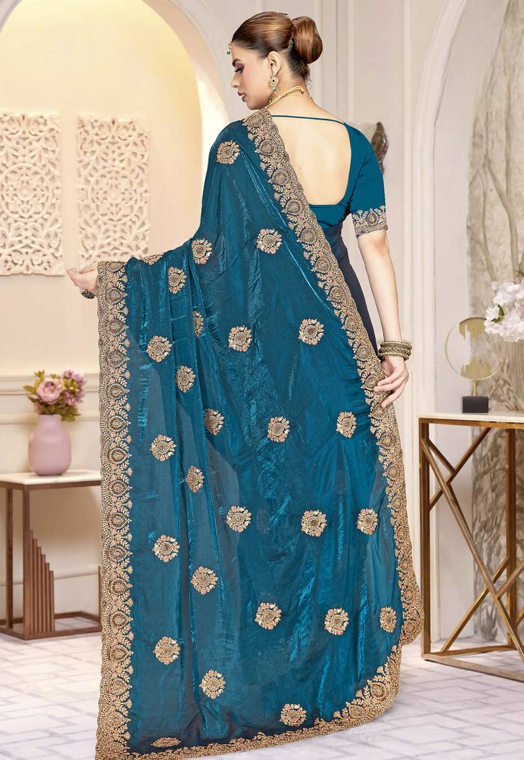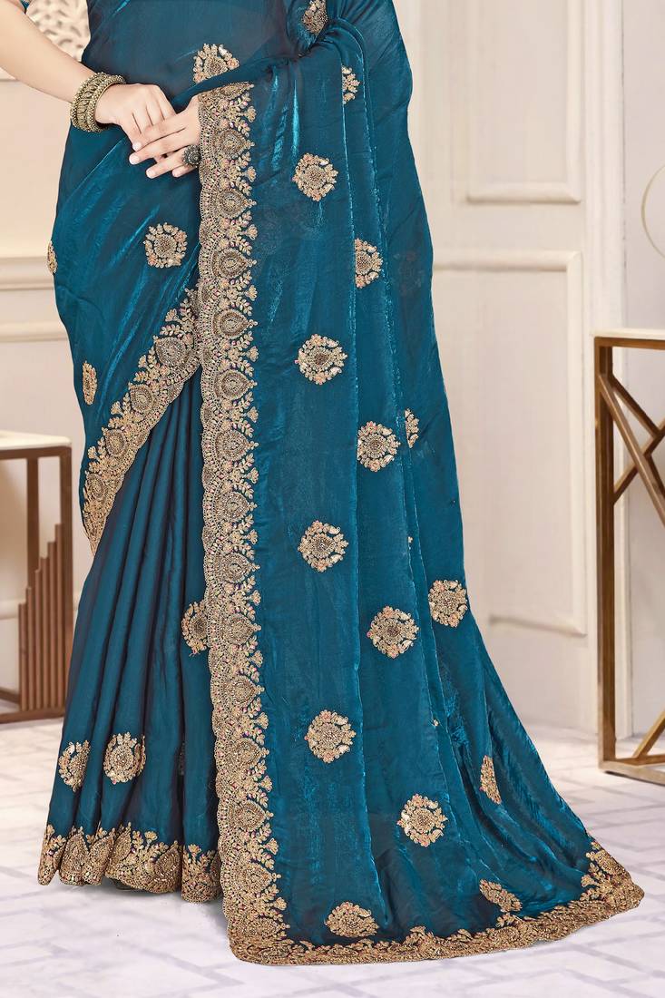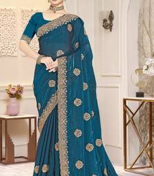 Teal blue color heavy coding zarkan embroidered work satin silk saree sari
