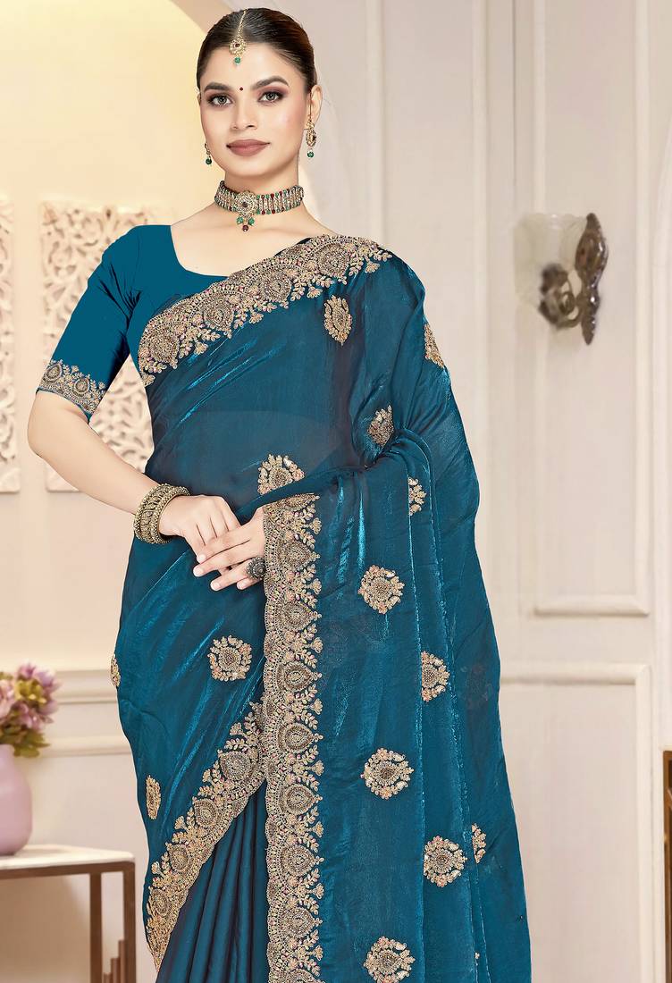 | Product Name | Teal Blue Color Heavy Coding Zarkan Embroidered Work Satin Silk Saree Sari | |
