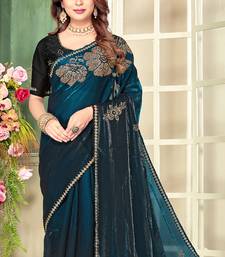 Teal blue half n half satin silk party wear wedding saree with matching blouse piece