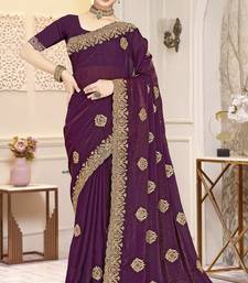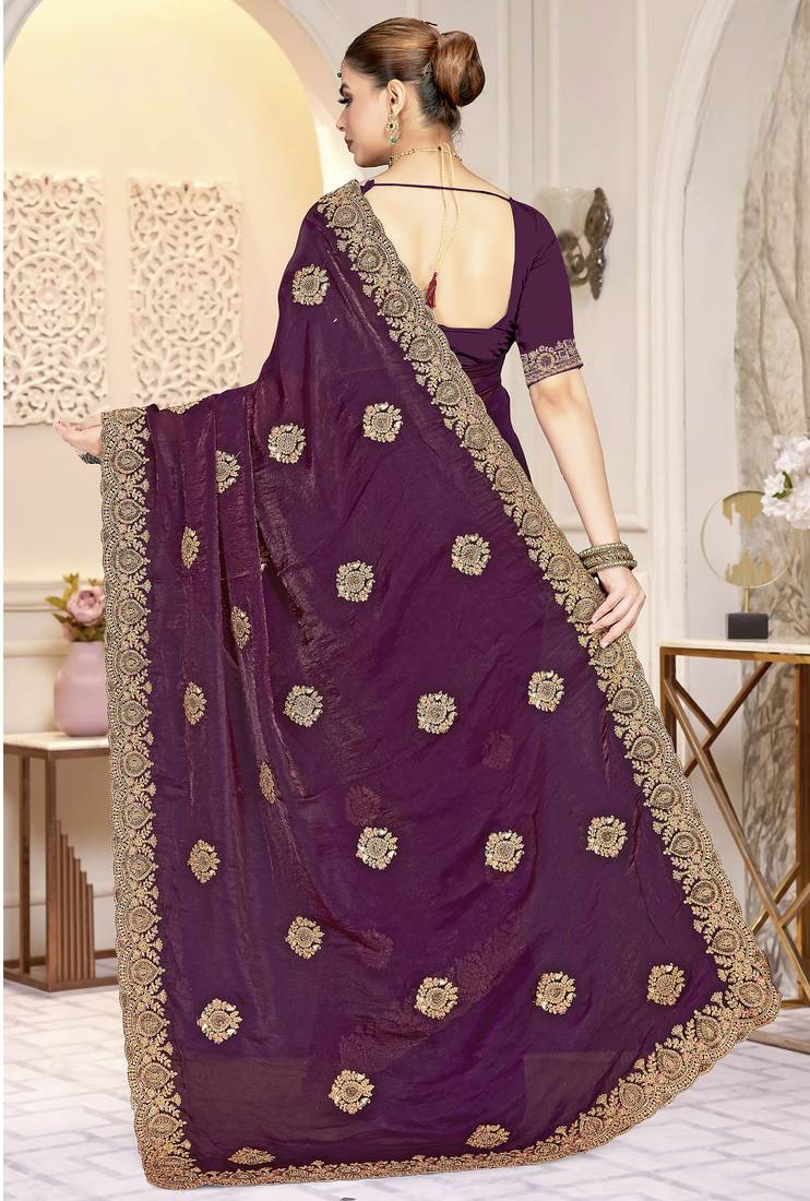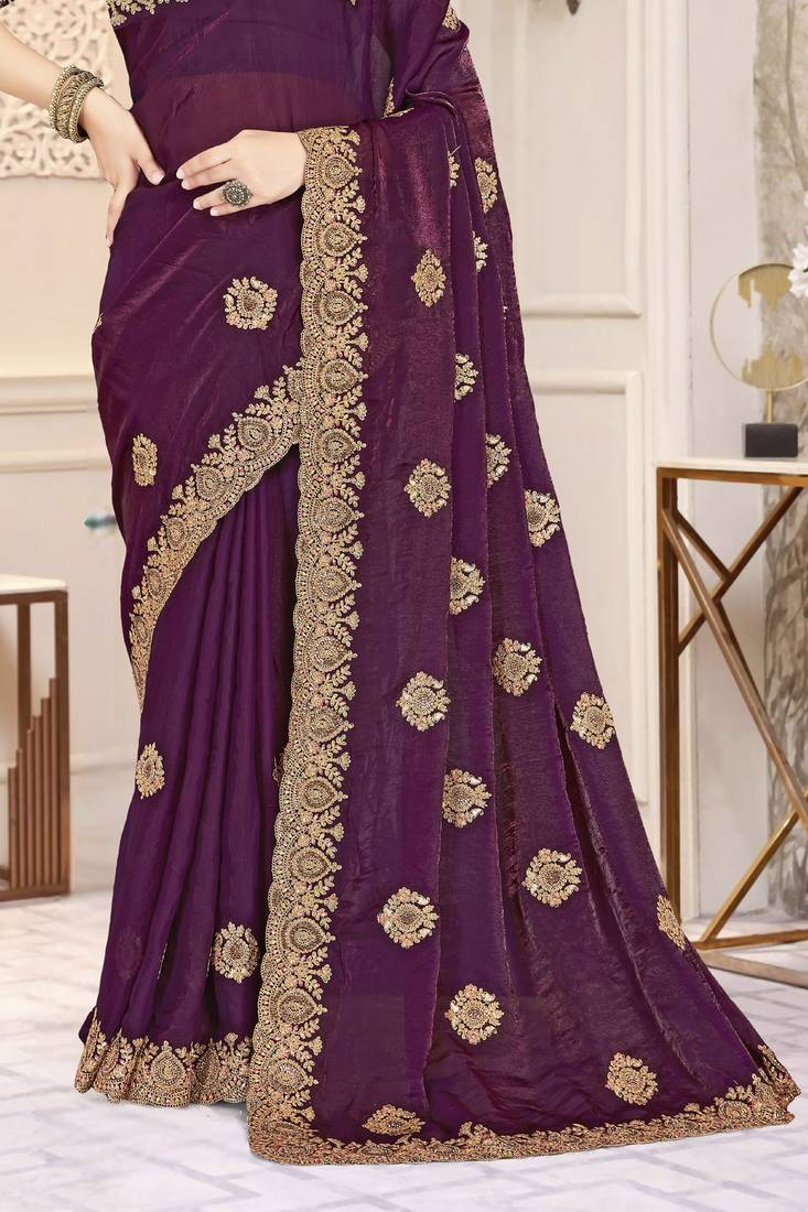 Wine color heavy coding zarkan embroidered work satin silk saree sari