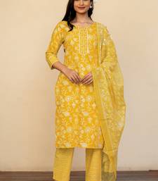 Women's mustard floral print pure cotton straight fit kurta set with bottom and dupatta (3-piece set)