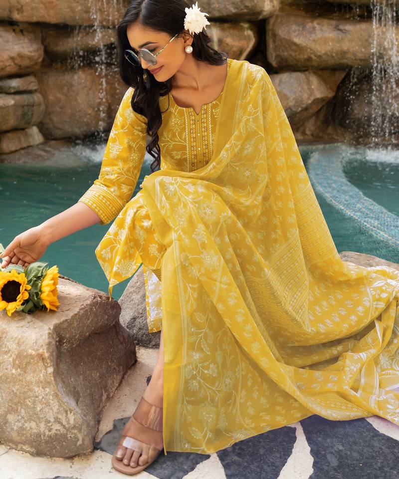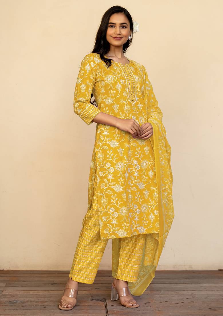 | Product Name | Women's Mustard Floral Print Pure Cotton Straight Fit Kurta Set With Bottom And Dupatta (3 Piece Set) | |