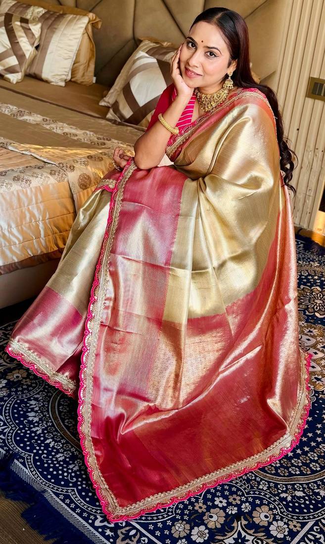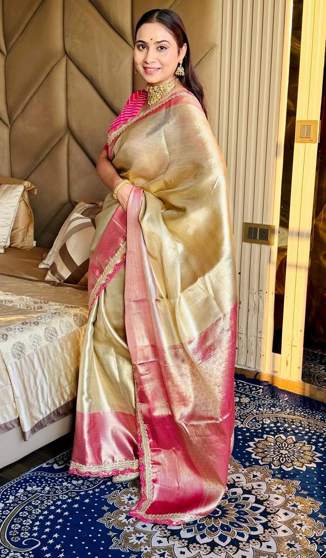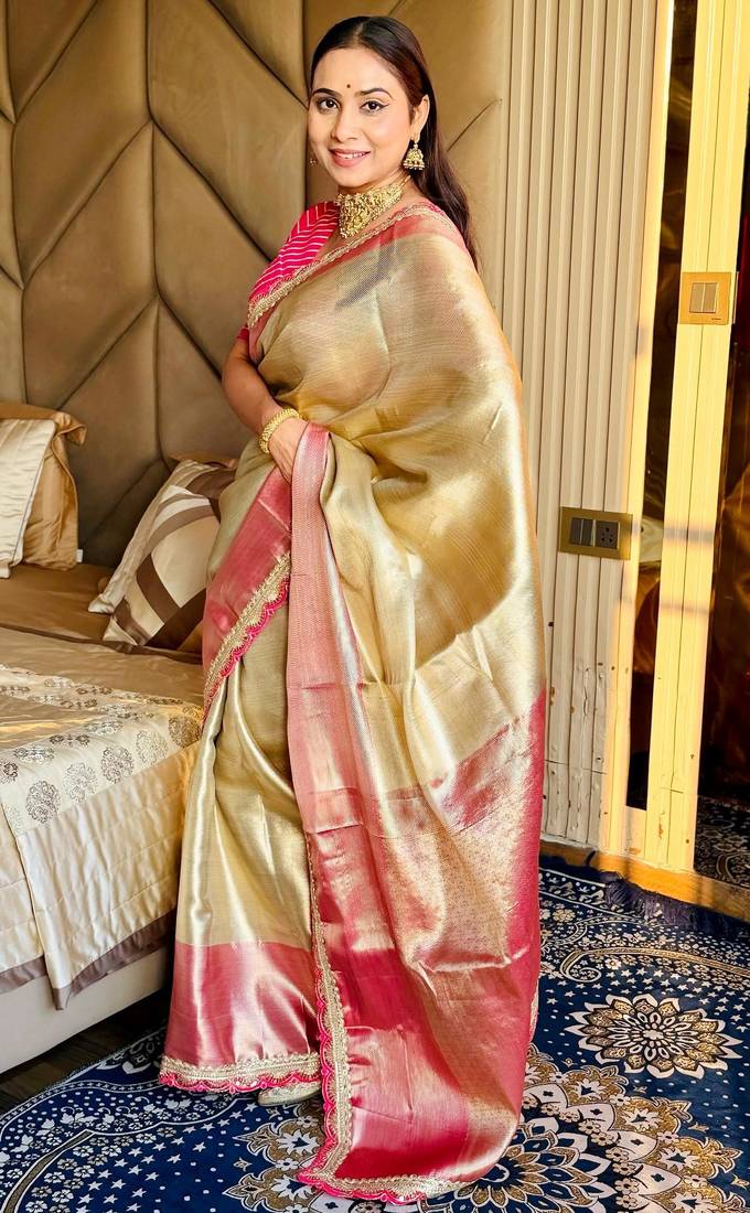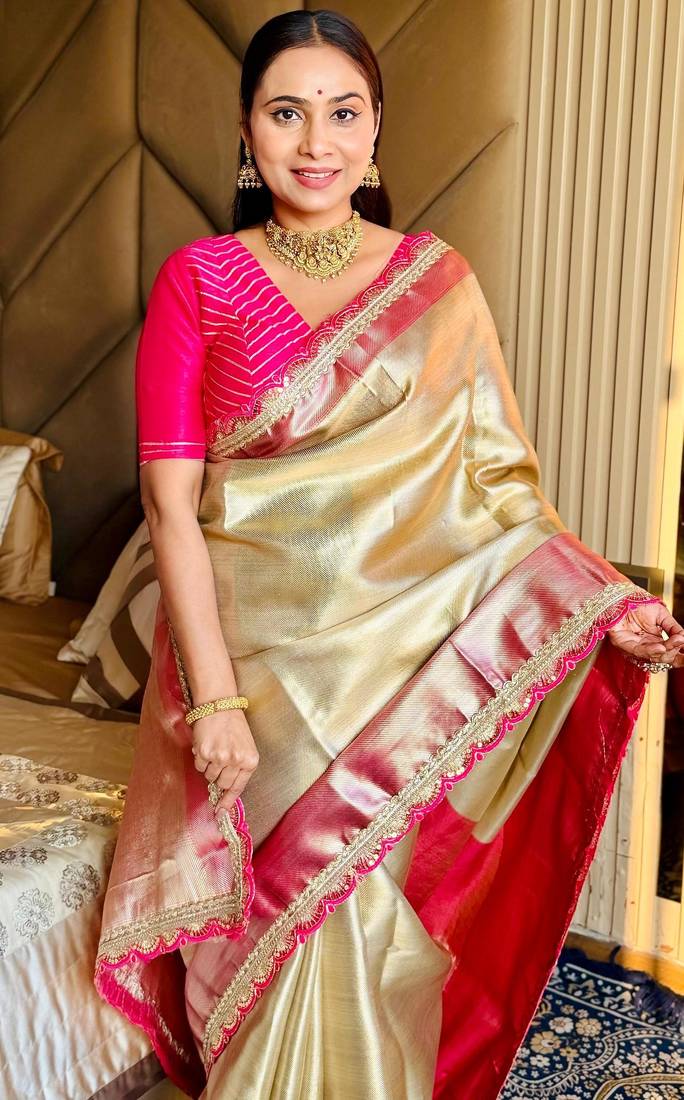 | Product Name | Cream Color Tissue Art Silk Saree With Contrast Blouse | |