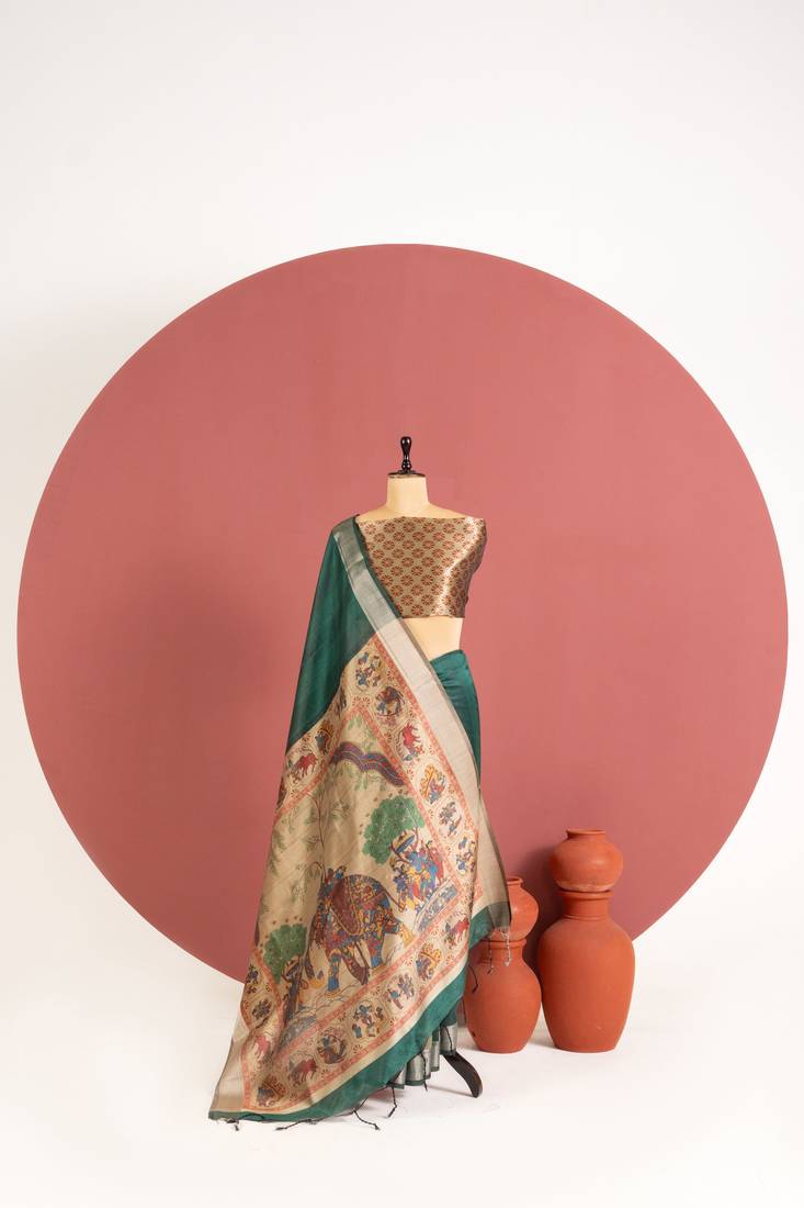 Dark green color khadi art silk saree with printed blouse