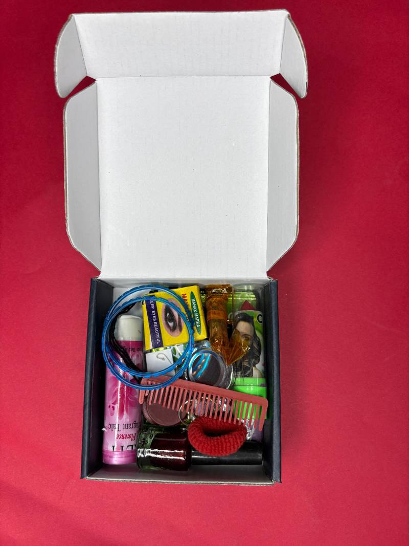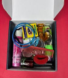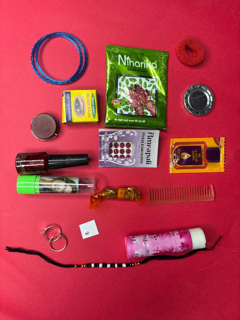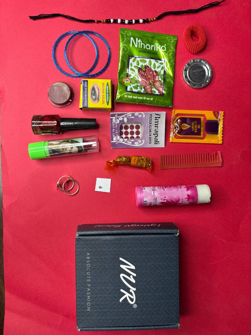 Nvr Collection Of Items That Appear To Be Part Of A Traditional Indian "Solah Shringar" Or Beauty And Accessories Gift Set, Often Used For Festivals Like Navratri Or Karwa Chauth, Or Given To A Bride. These Items, Which Include Products From Brands Such As Niharika, Amrapali, And Nur, Are Associated With A Married Woman's Traditional Beautification Process.  A Box Labeled "Nvr Fashion," Likely The Packaging For The Entire Gift Set Or A Larger Item Within It.