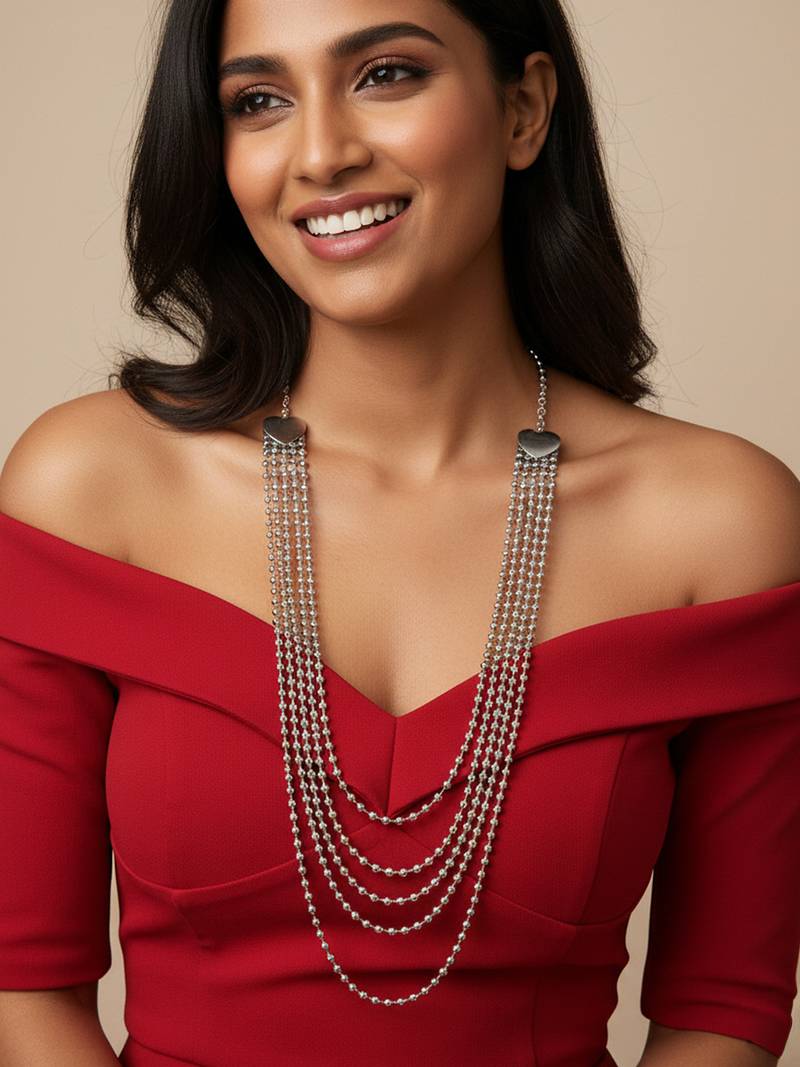 | Product Description | This Item Is A Nvr Women Multi Strand Ball Chain Necklace With Heart Accents Featuring Polished Heart Shaped Plaques At Each End That Connect To An Adjustable Chain And Clasp. The Piece Typically Includes Around Four Separate Strands Of Uniform, Metallic Sphere Beads. Features A Bright, Polished Finish On The Beads And A Lobster Or S Hook Clasp With An Extension Chain For An Adjustable And Comfortable Fit. Can Be Worn As A Statement Multi Layered Necklace Or As A Trendy Waist/Belly Chain, Suitable For Both Ethnic Attire Like Sarees And Lehengas, Or With Modern Western Wear. |