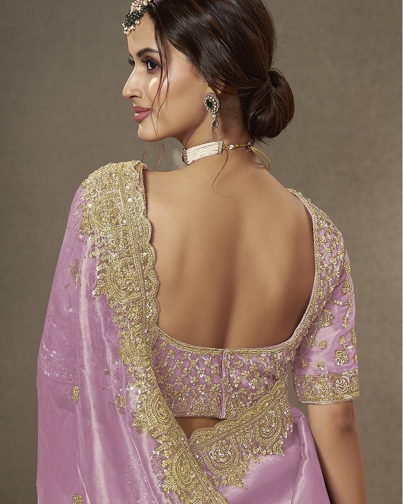 Lavender beads work party wear tissue saree with designer beads work blouse fabric