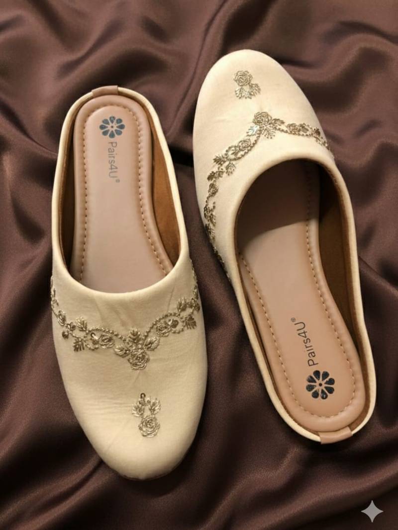 | Product Description | Step Into Effortless Elegance With These Beautifully Crafted Ethnic Mule Flats From Pairs4 U. Designed To Complement Festive And Traditional Outfits, These Slip On Mules Feature Intricate Embroidery Detailing That Adds A Touch Of Sophistication And Charm. The Stylish Closed Toe Silhouette Combined With A Comfortable Cushioned Footbed Makes Them Perfect For Long Celebrations, Weddings, And Festive Gatherings. |