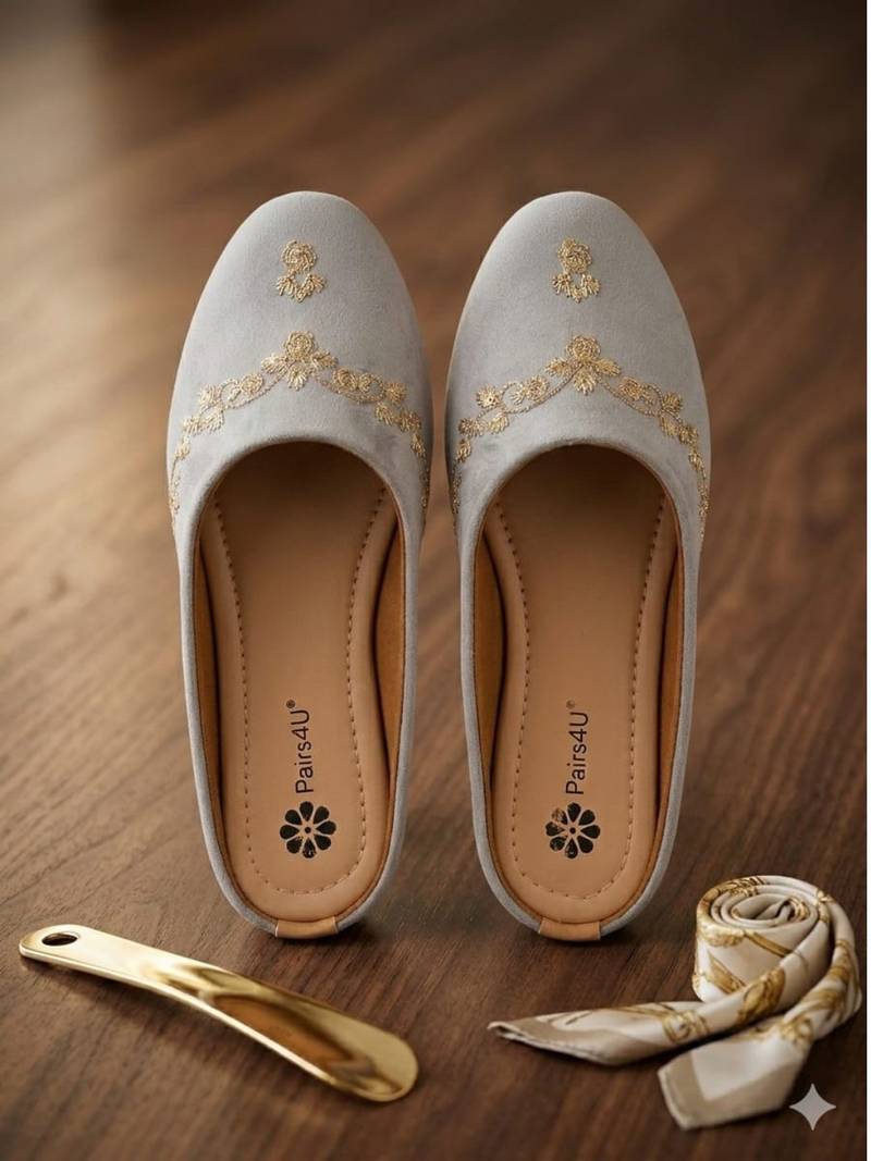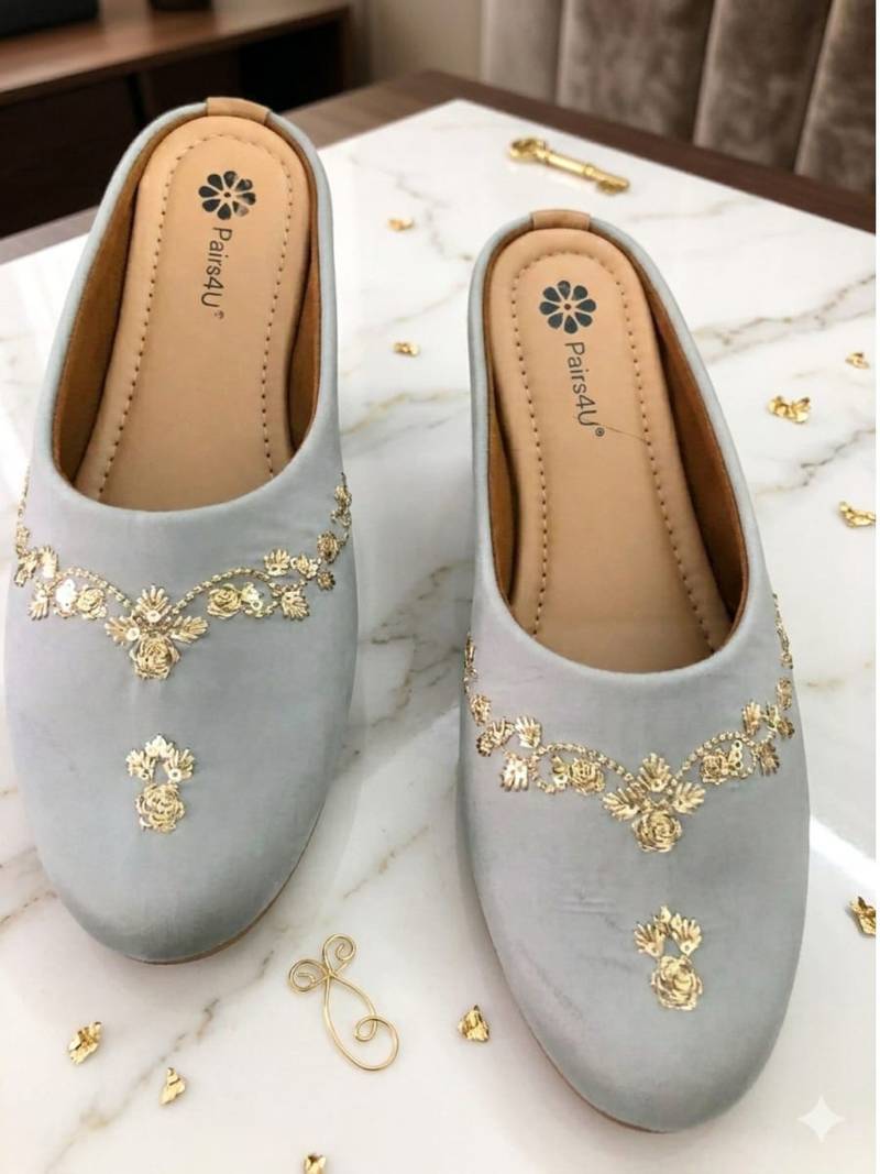 | Product Description | Step Into Effortless Elegance With These Beautifully Crafted Ethnic Mule Flats From Pairs4 U. Designed To Complement Festive And Traditional Outfits, These Slip On Mules Feature Intricate Embroidery Detailing That Adds A Touch Of Sophistication And Charm. The Stylish Closed Toe Silhouette Combined With A Comfortable Cushioned Footbed Makes Them Perfect For Long Celebrations, Weddings, And Festive Gatherings. |