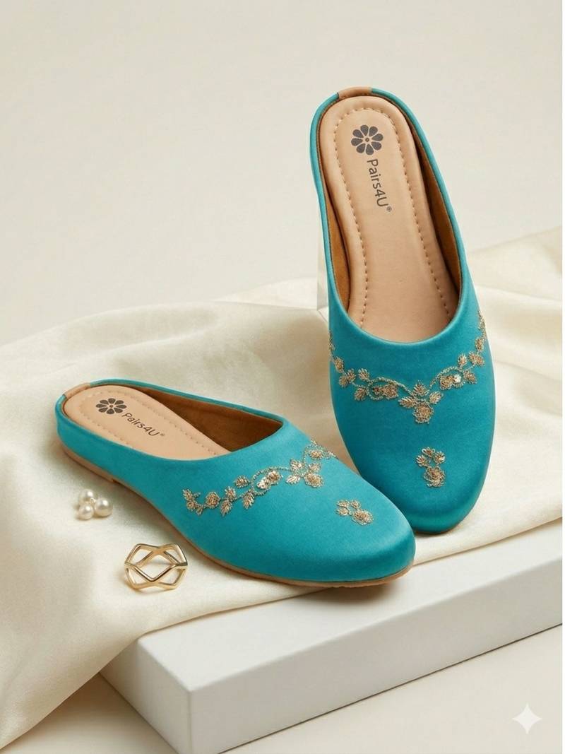 | Product Description | Step Into Effortless Elegance With These Beautifully Crafted Ethnic Mule Flats From Pairs4 U. Designed To Complement Festive And Traditional Outfits, These Slip On Mules Feature Intricate Embroidery Detailing That Adds A Touch Of Sophistication And Charm. The Stylish Closed Toe Silhouette Combined With A Comfortable Cushioned Footbed Makes Them Perfect For Long Celebrations, Weddings, And Festive Gatherings. |