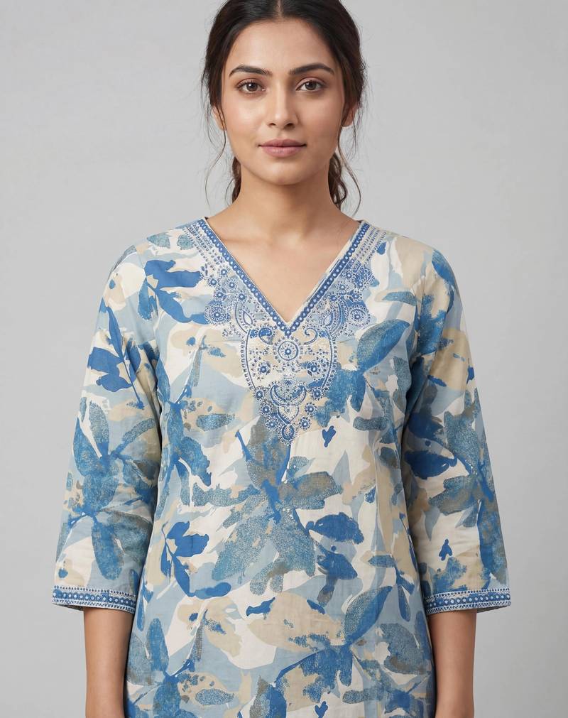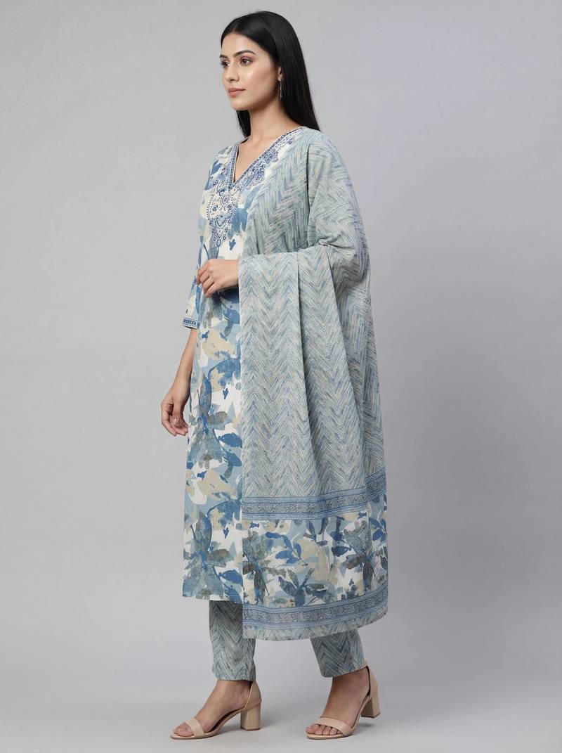 | Product Description | Women Blue Cotton Printed Kurta Pant Dupatta Set With Hand Work And Embroidered Lace |