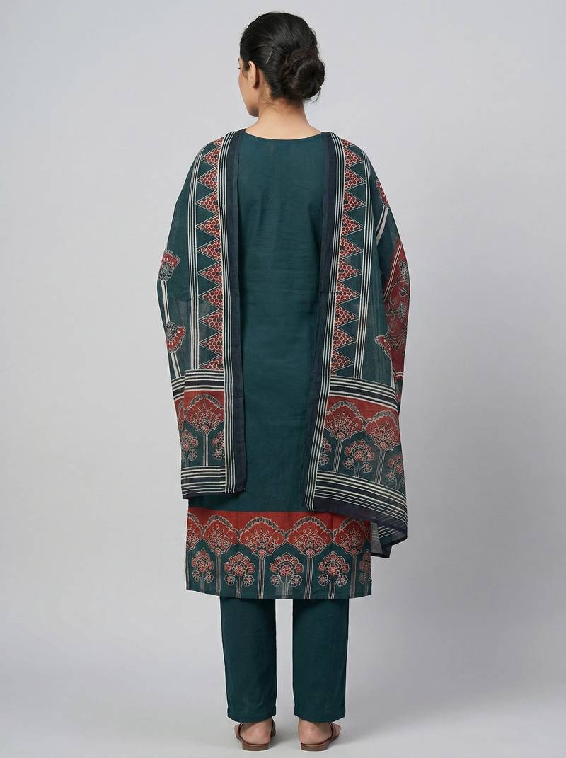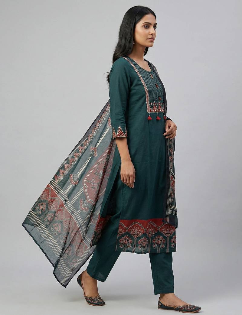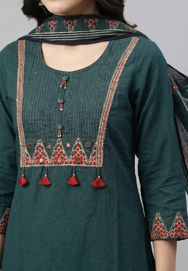 | Product Description | Women Green Cotton Printed Kurta Pant Dupatta Set With Gota Work And Lace |