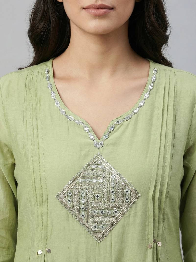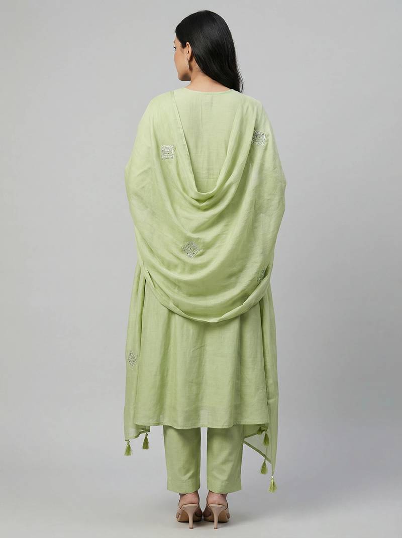 | Product Description | Women Light Green Cotton Printed Kurta Pant Dupatta Set With Hand Work And Embroidered Lace |
