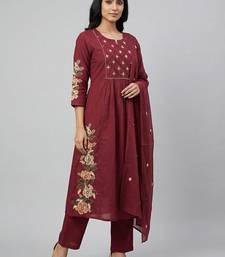 Women maroon cotton printed kurta pant dupatta set with hand work and embroidered
