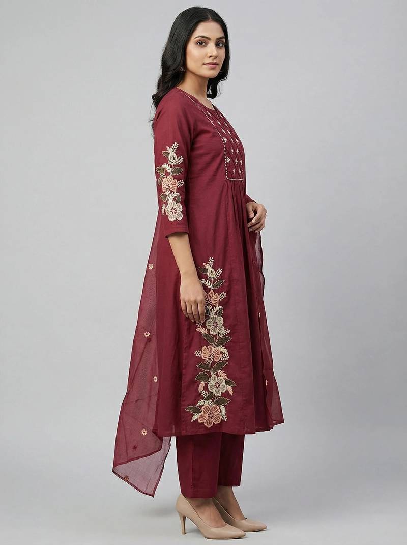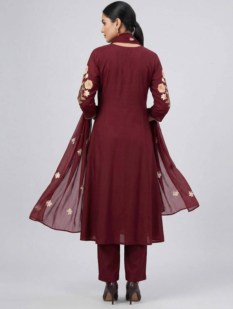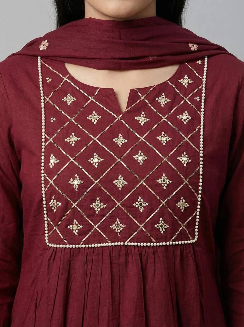 | Product Description | Women Maroon Cotton Printed Kurta Pant Dupatta Set With Hand Work And Embroidered |