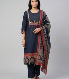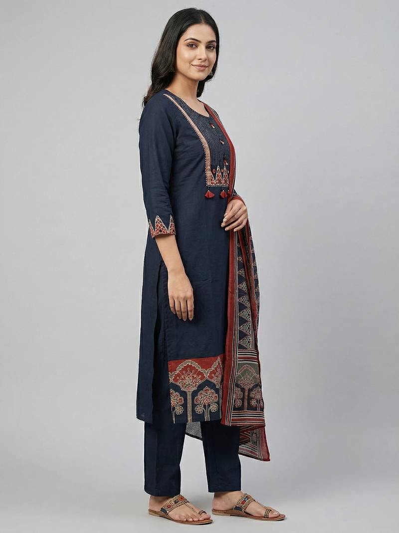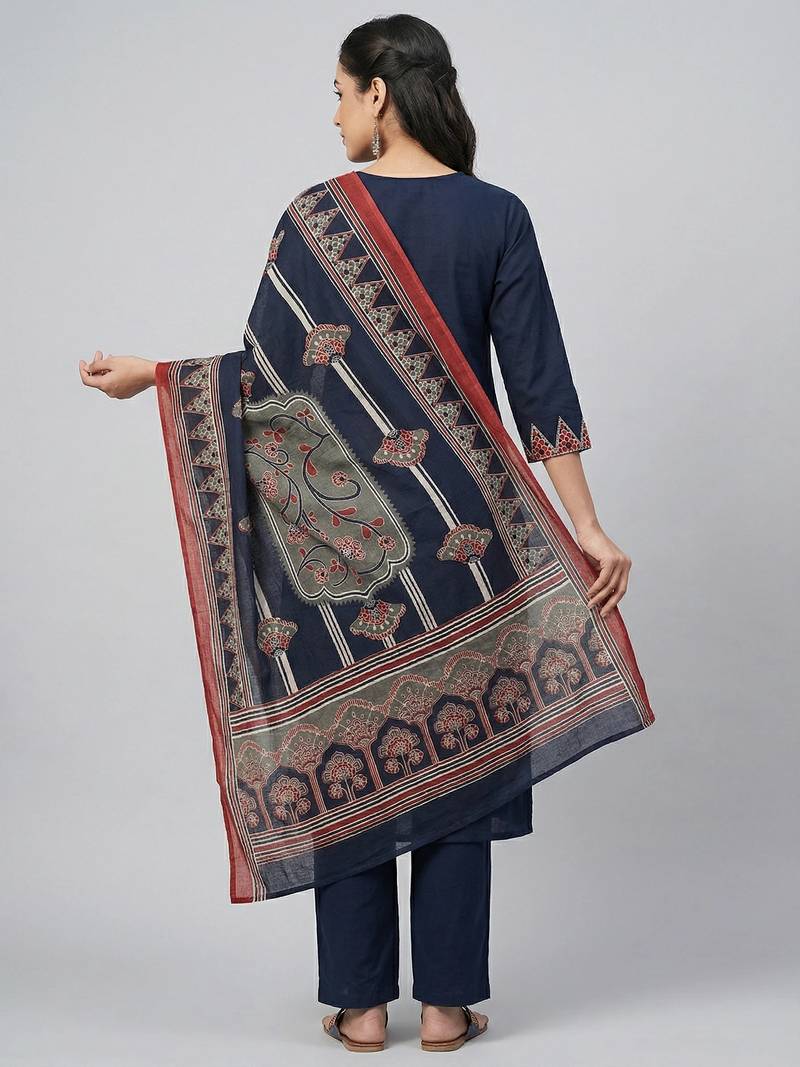 | Product Name | Women Navy Blue Cotton Printed Kurta Pant Dupatta Set With Gota Work And Lace | |