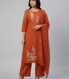 Women orange cotton printed kurta pant dupatta set with hand work and embroidered