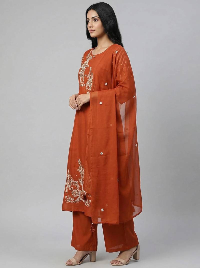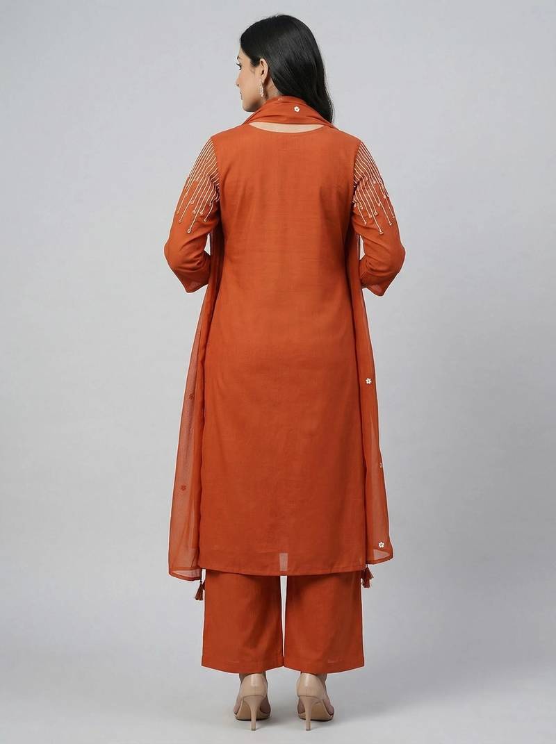 Product Name Women Orange Cotton Printed Kurta Pant Dupatta Set With Hand Work And Embroidered