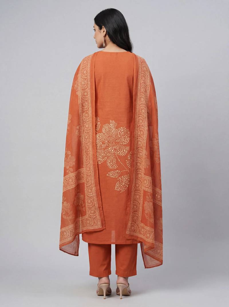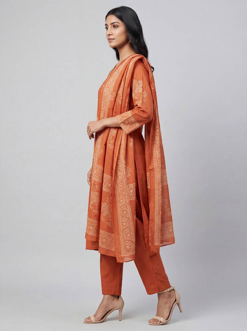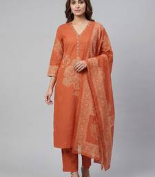 | Product Description | Women Orange Cotton Printed Kurta Pant Dupatta Set With Hand Work |