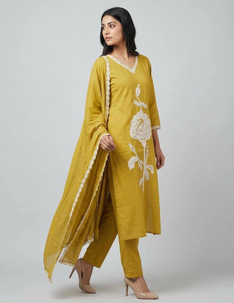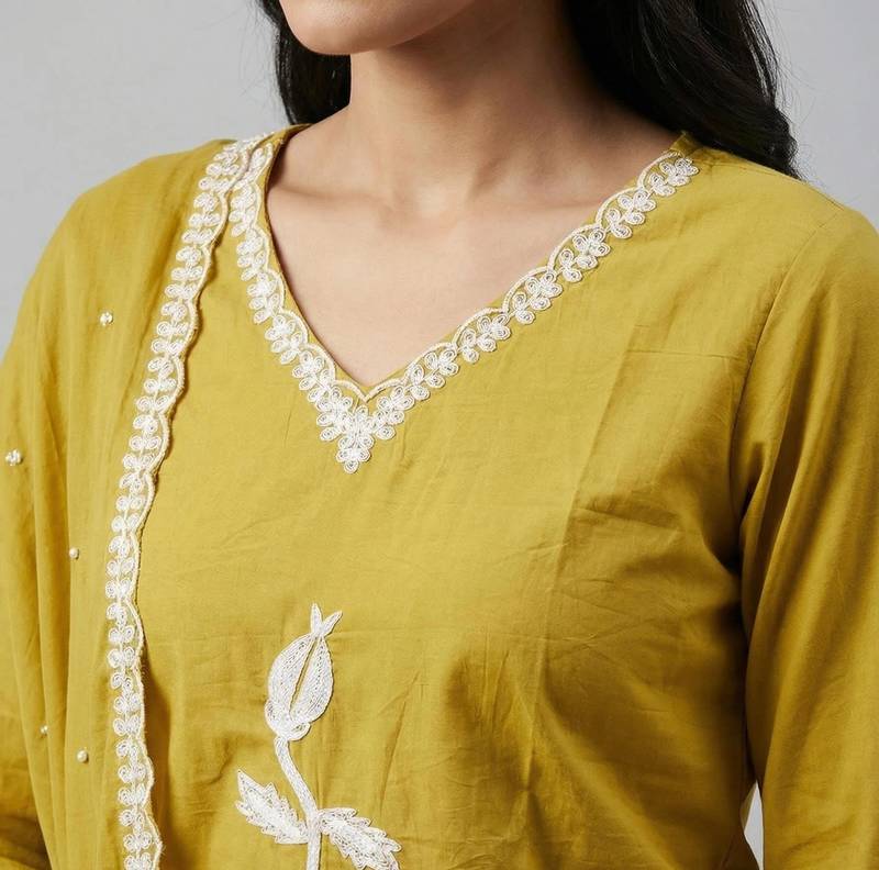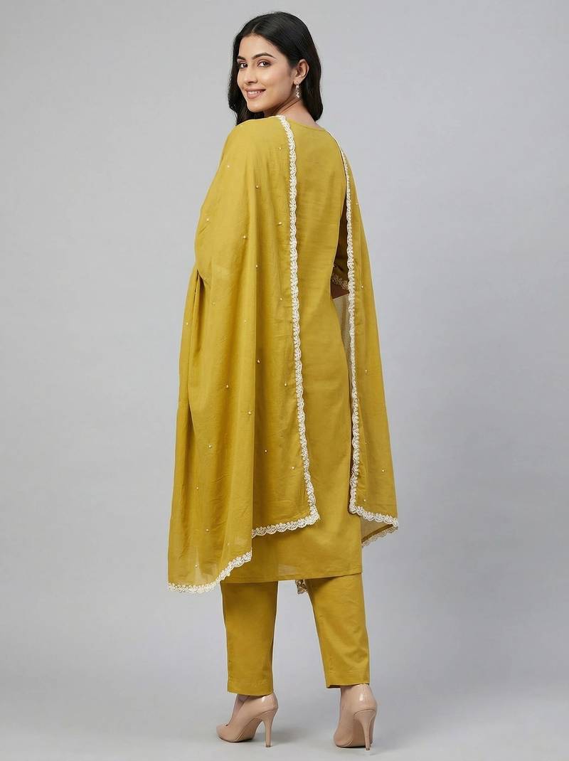 | Product Description | Women Yellow Cotton Printed Kurta Pant Dupatta Set With Hand Work And Embroidered Lace |