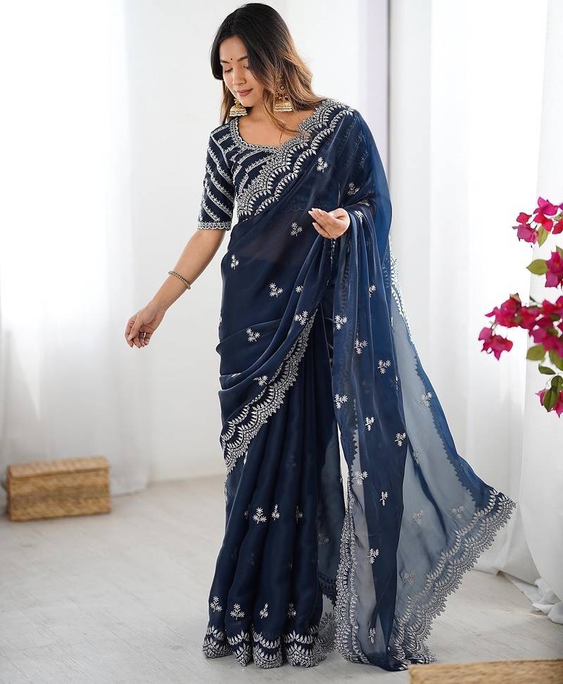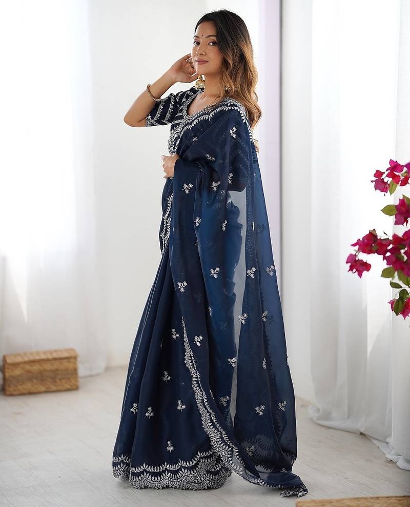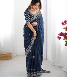 Blue color art silk blend thread sequince embroidered saree with blouse