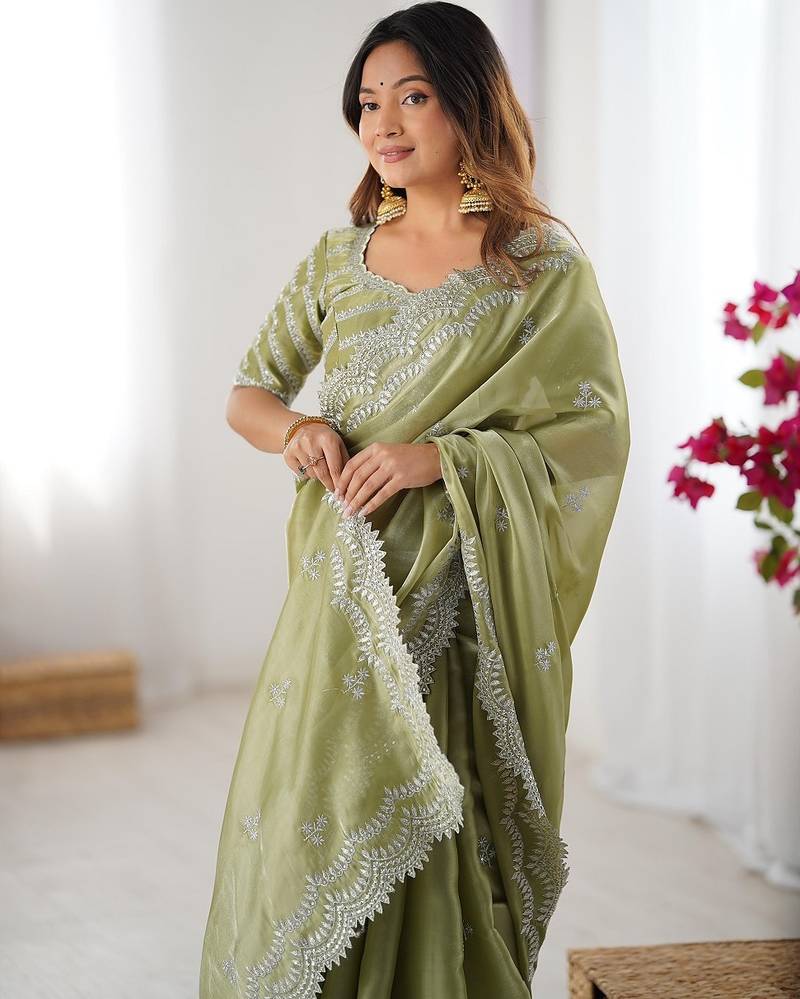 Pista green color art silk blend thread sequince embroidered saree with blouse