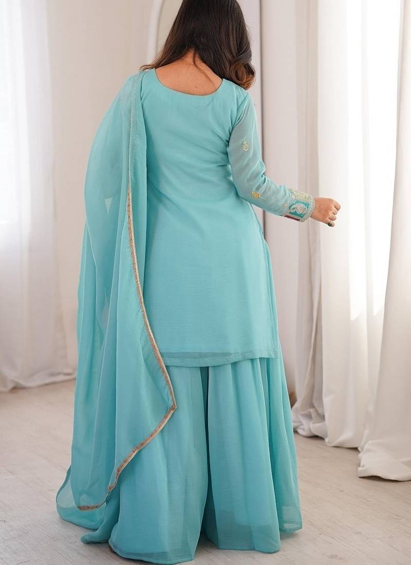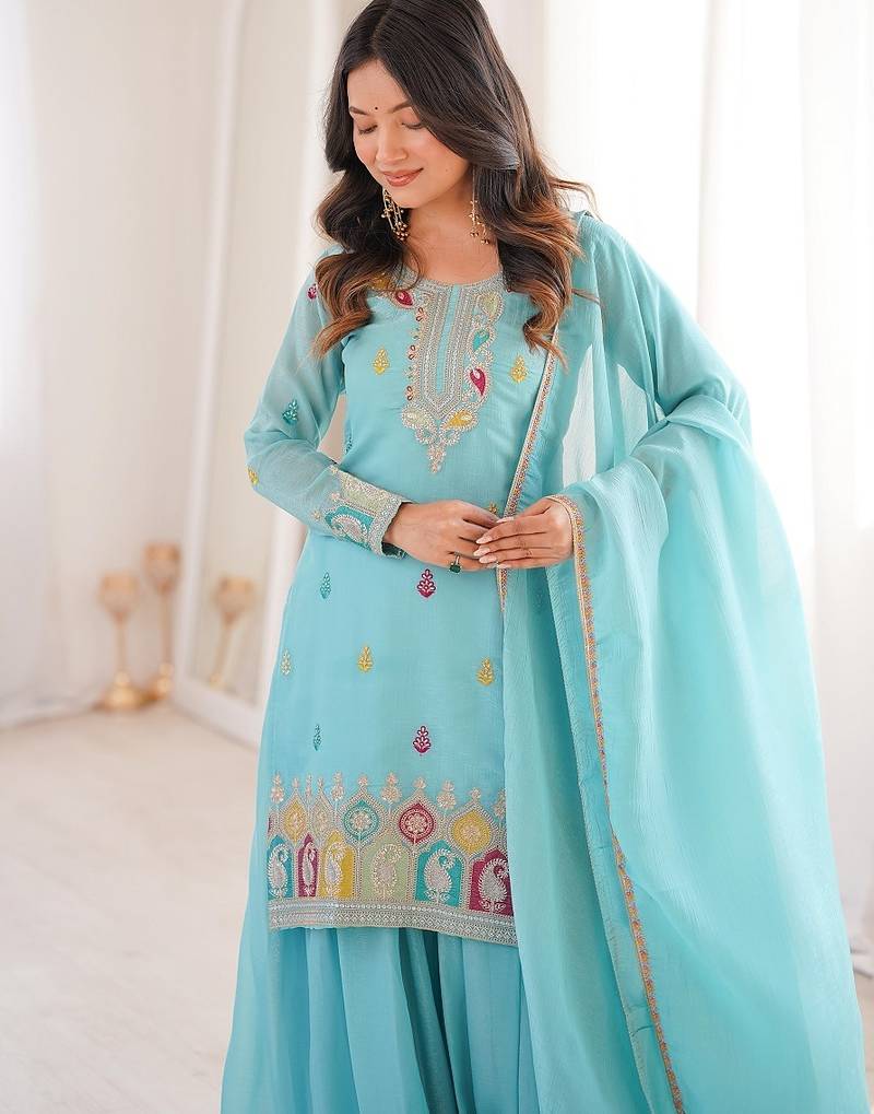 Sky blue color thread zari sequince embroidered work crunchy silk anarkali set stitched