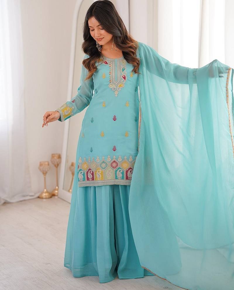 | Product Name | Sky Blue Color Thread Zari Sequince Embroidered Work Crunchy Silk Anarkali Set | |