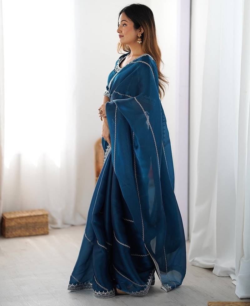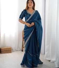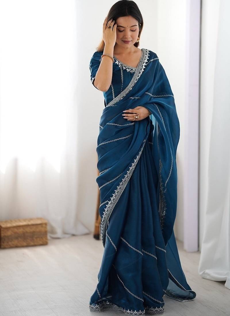 Teal blue color art silk blend thread sequince embroidered work saree with blouse