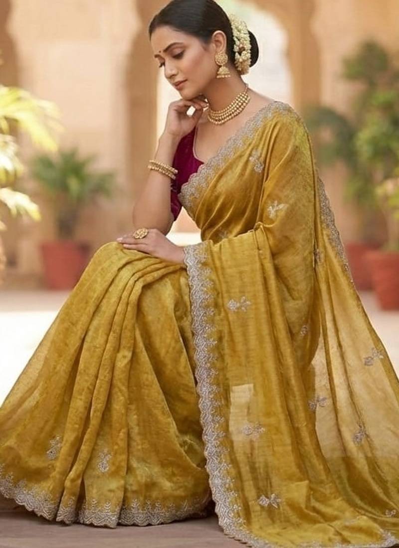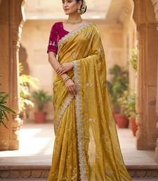 Mustard color embroidery jari and sequance work space silk saree