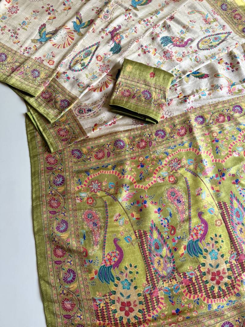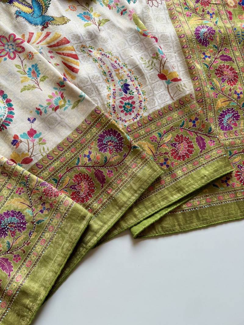 Olive color digital pashmina test print with siroski hand work naylon viscos softy silk saree