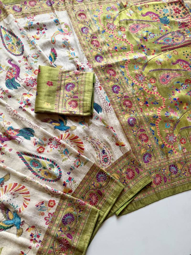 Olive Color Digital Pashmina Test print With Siroski Hand Work Naylon Viscos Softy Silk Saree