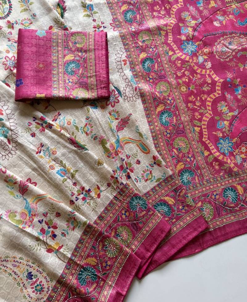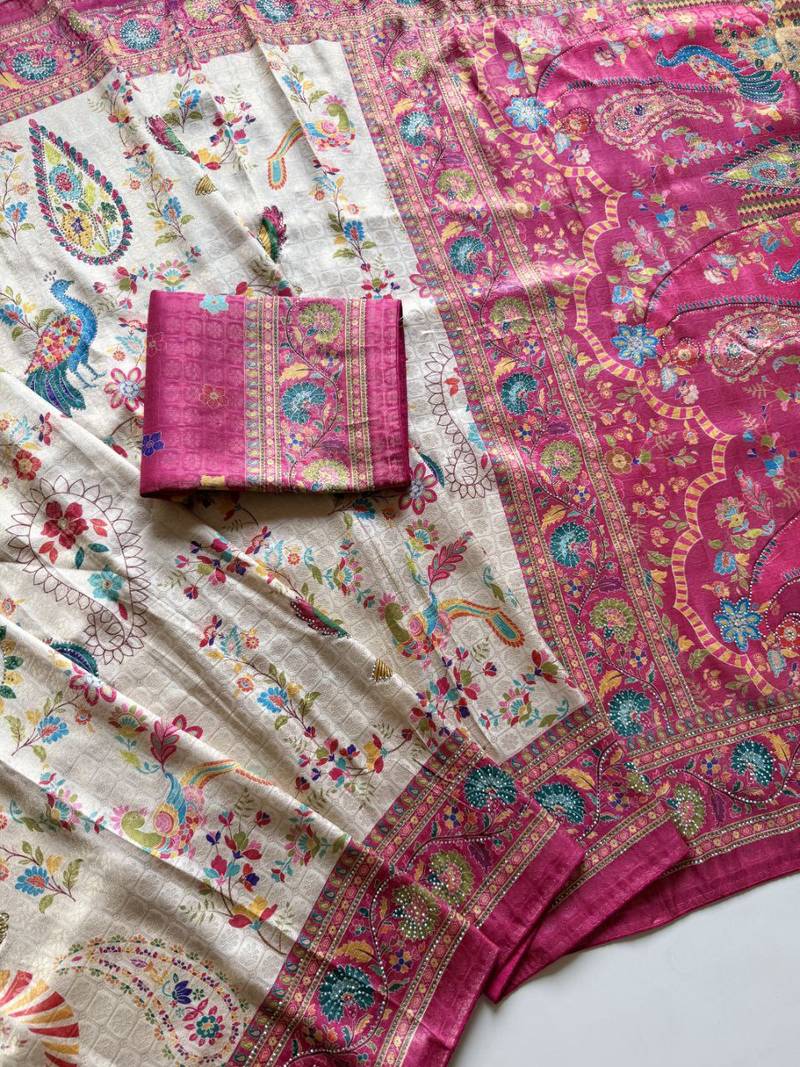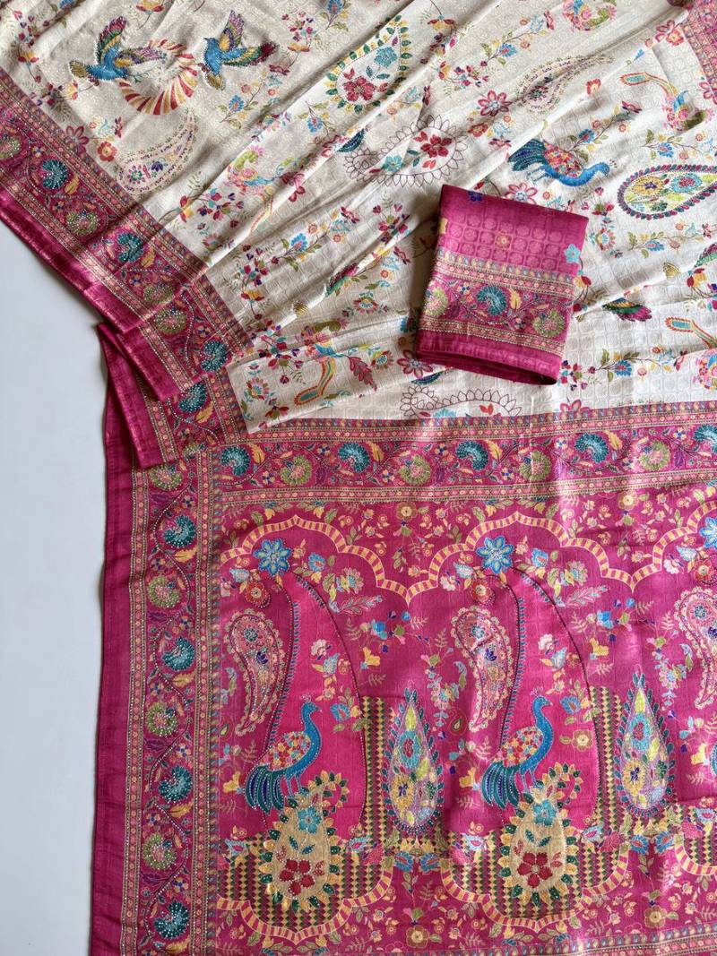 | Product Name | Rani Pink Color Digital Pashmina Test Print With Siroski Hand Work Naylon Viscos Softy Silk Saree | |