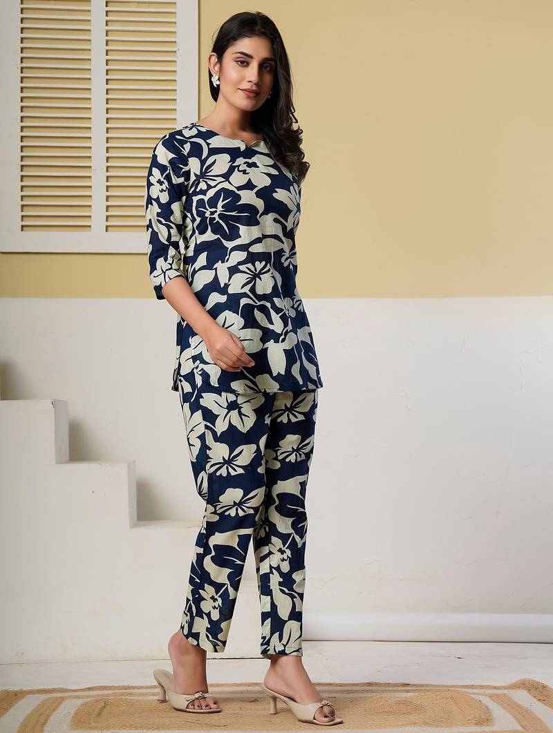 | Product Name | Navy Blue Floral Printed Kurti With Straight Pants – Cotton Co Ord Set | |