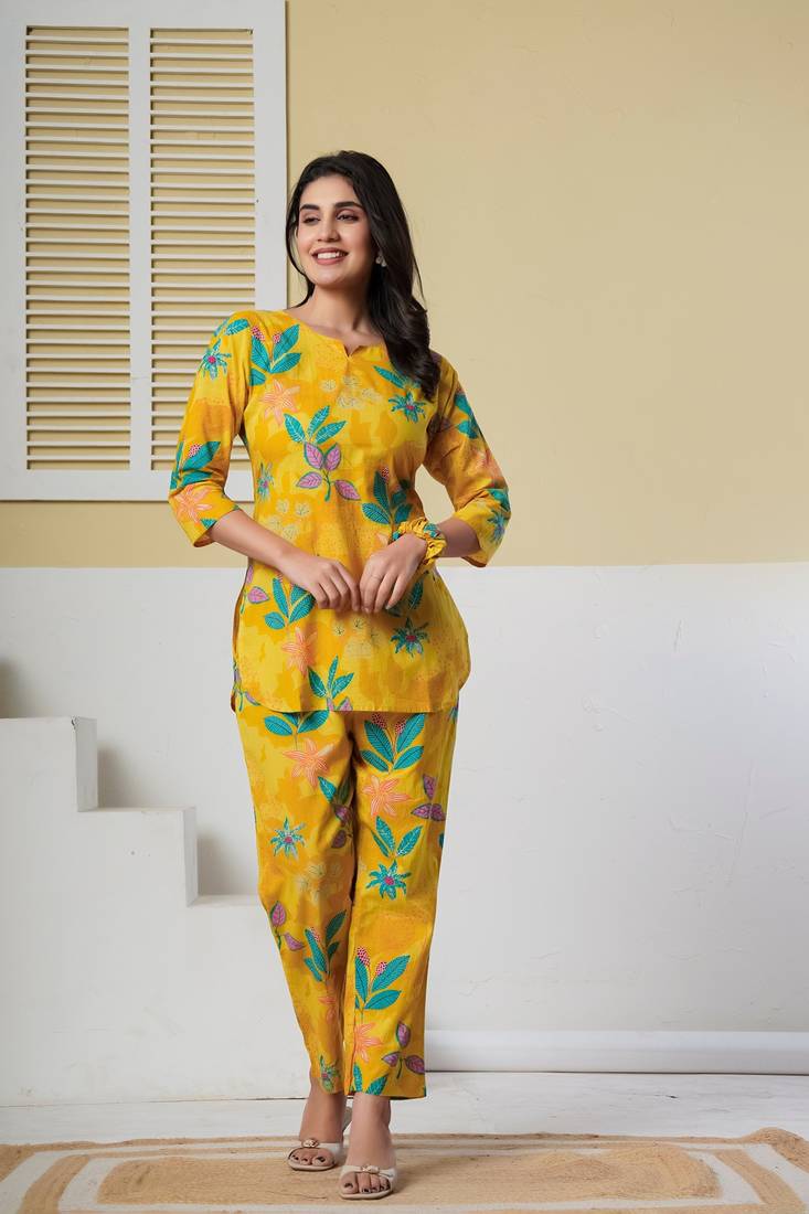 Product Name Yellow Floral Printed Kurti With Straight Pants – Cotton Co Ord Set