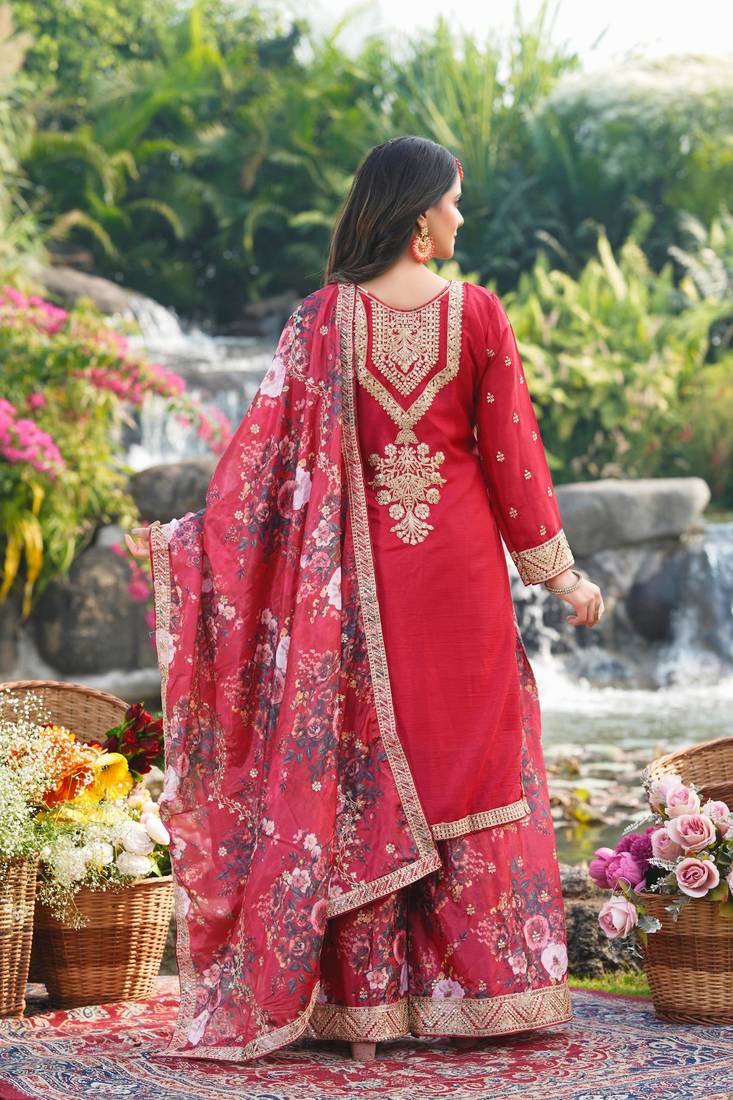 Elegant Red Straight Kurta Palazzo Set Crafted In Premium Chinon Fabric For A Rich And Graceful Ethnic Look.