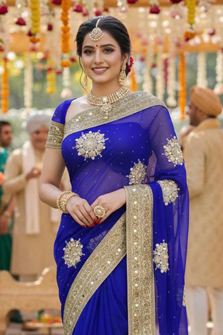 | Product Name | Georgette Wedding Wear Saree In Blue With Embroidery Work & Crystal Stone Work | |