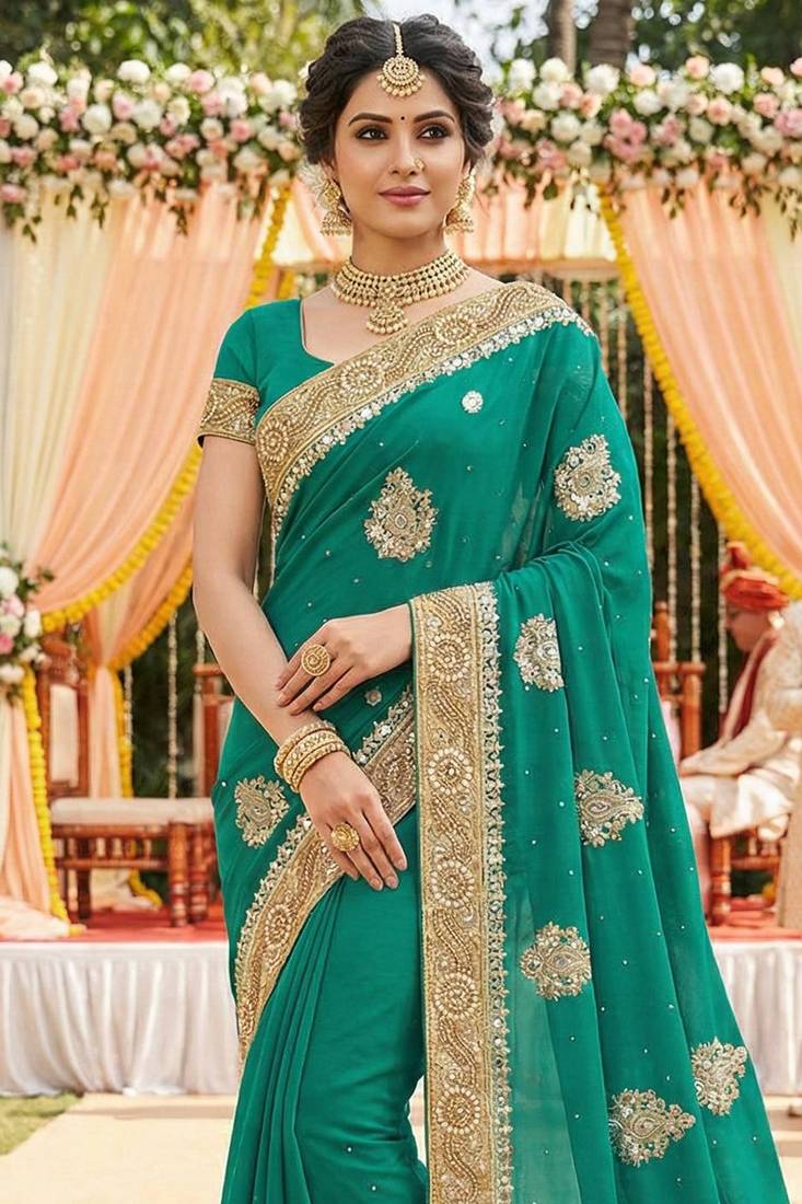 Product Name Georgette Wedding Wear Saree In Green With Embroidery & Crystals Stone Work