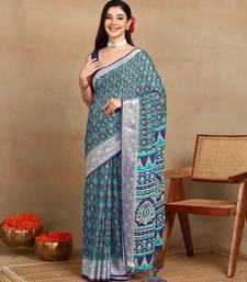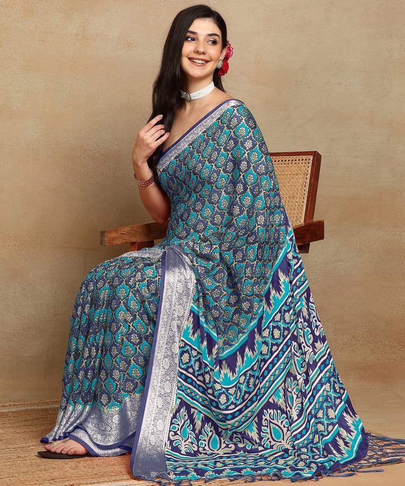 Mirchi fashion block print georgette saree with unstitched blouse piece (blue)