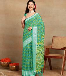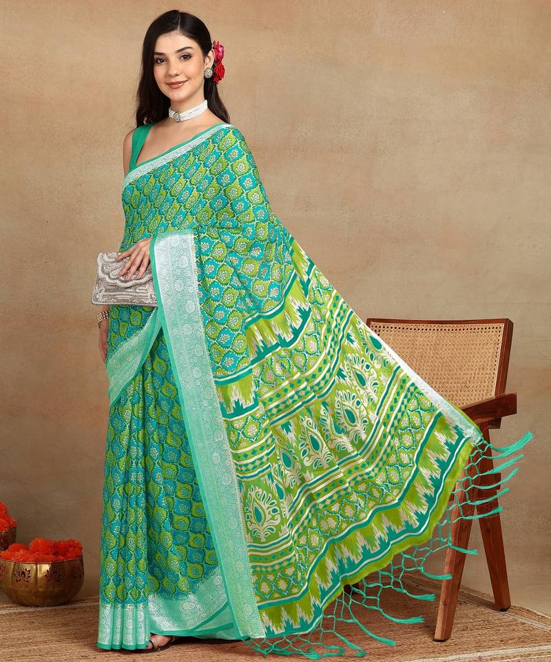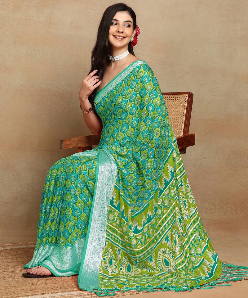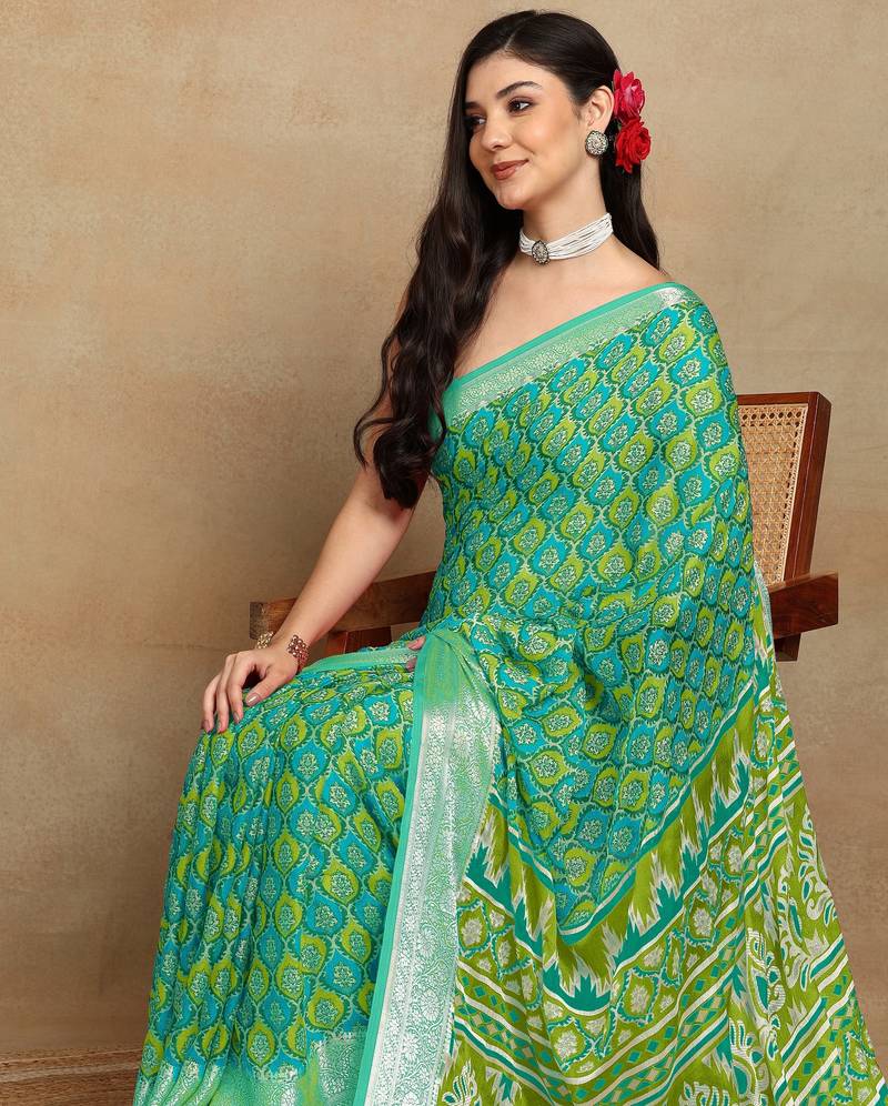 Mirchi fashion block print georgette saree with unstitched blouse piece (green)
