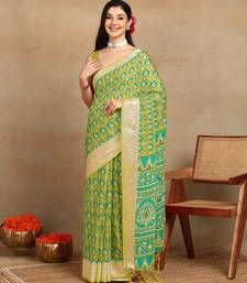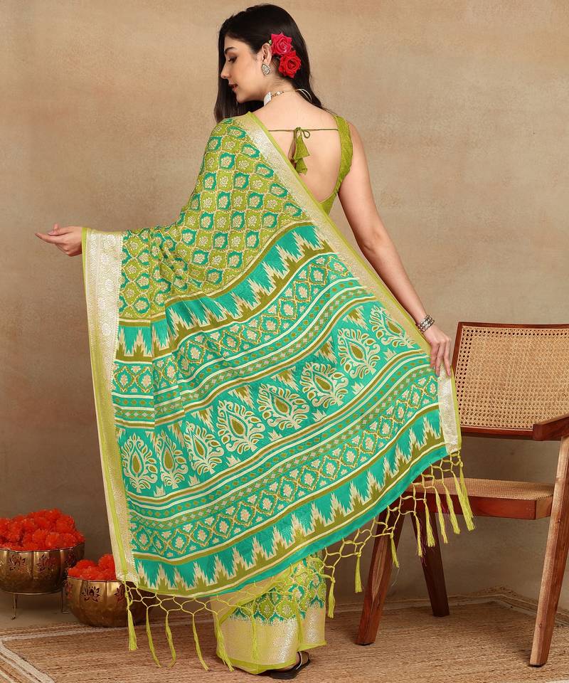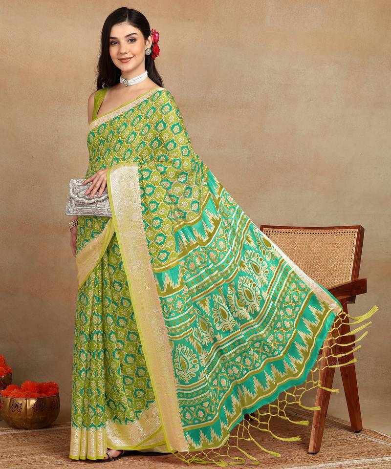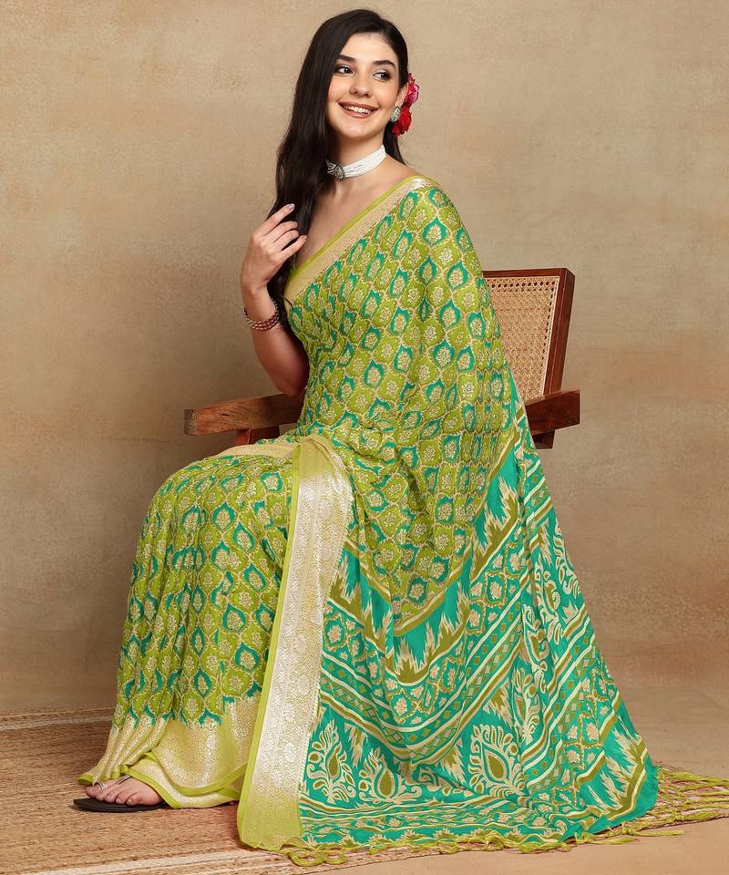 Mirchi fashion block print georgette saree with unstitched blouse piece (green)