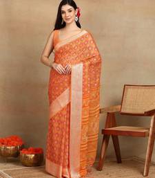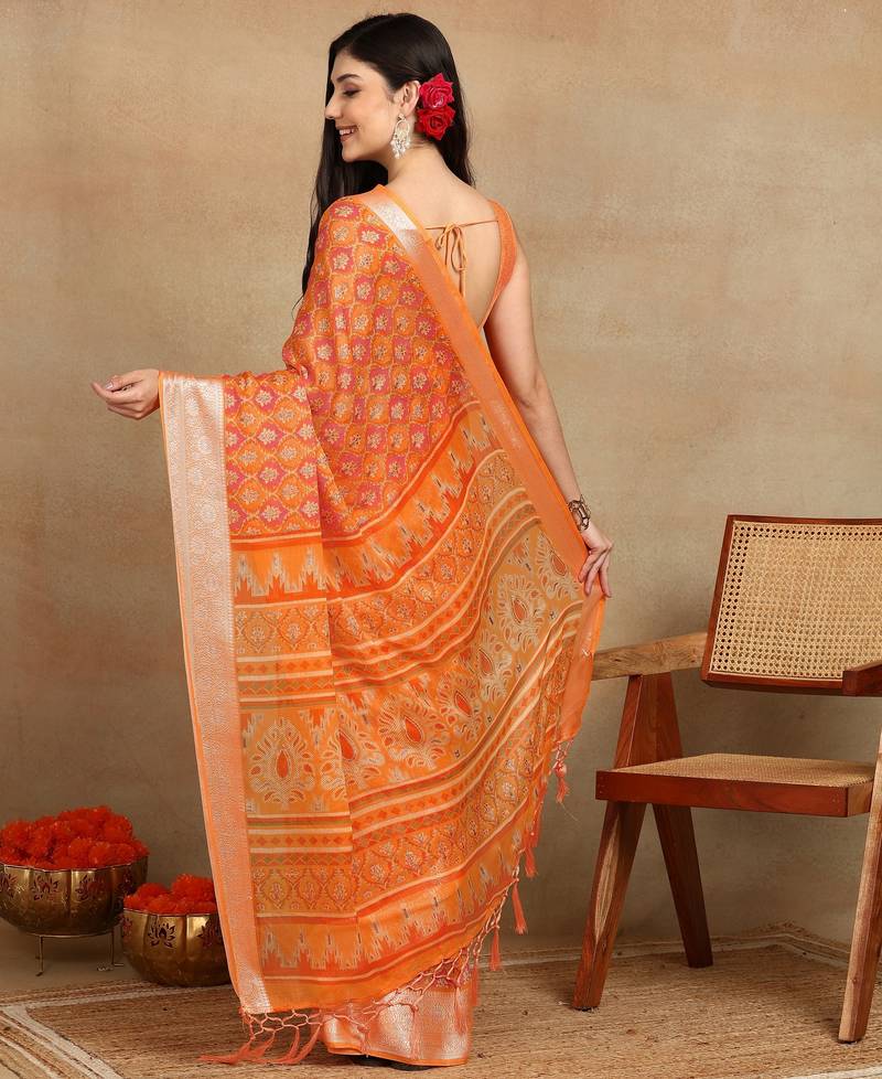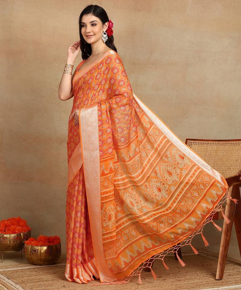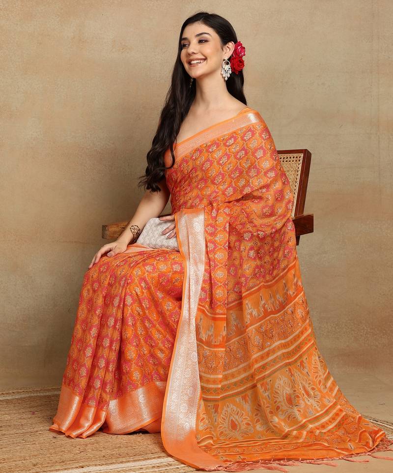 Mirchi fashion block print georgette saree with unstitched blouse piece (orange)