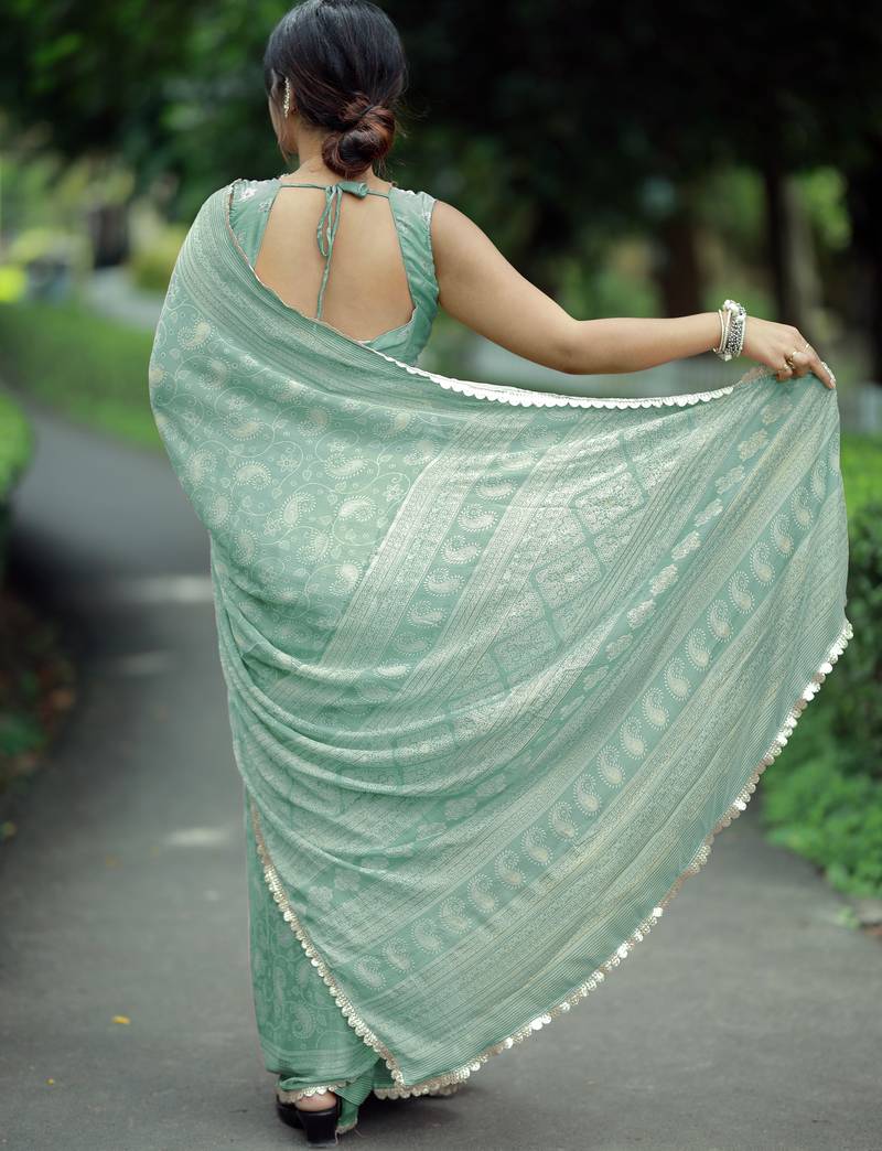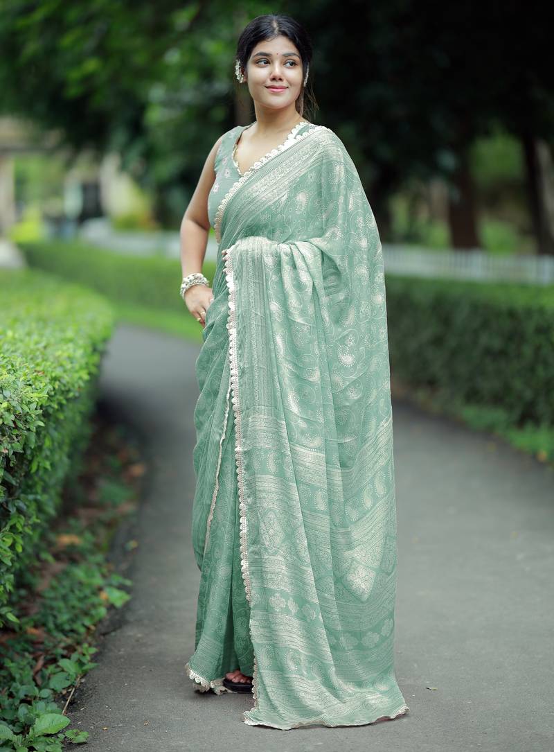 Mirchi fashion paisle print chiffon saree with unstitched blouse piece (teal)