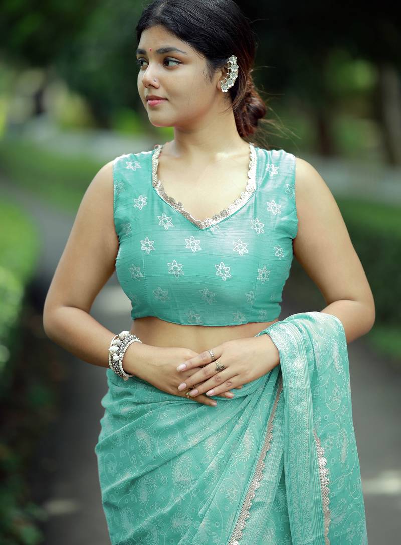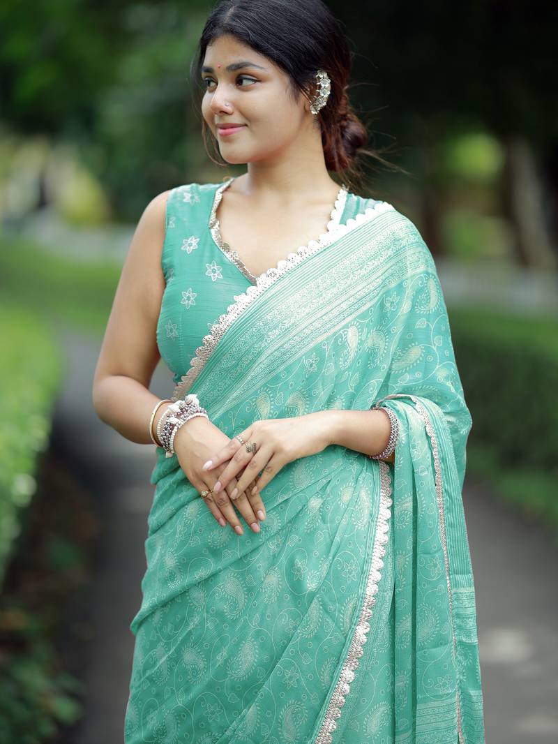 Mirchi fashion paisle print chiffon saree with unstitched blouse piece (turquoise)