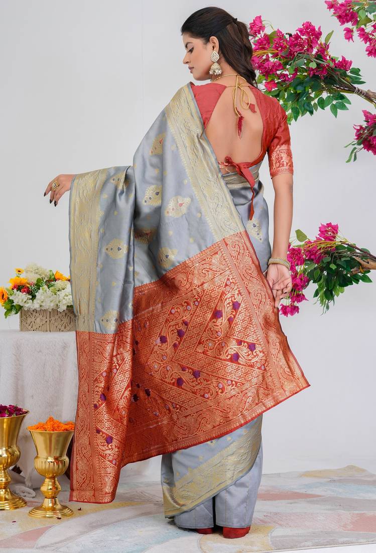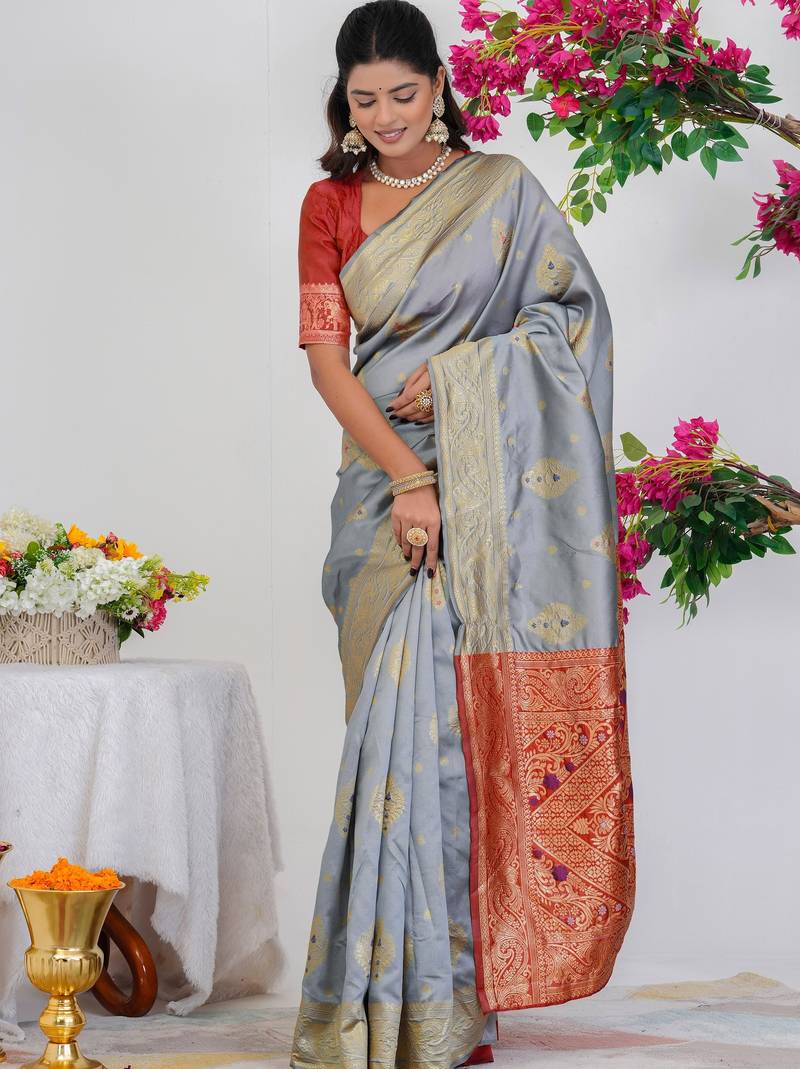 Subham woven design silk blend saree with unstitched blouse piece (grey)